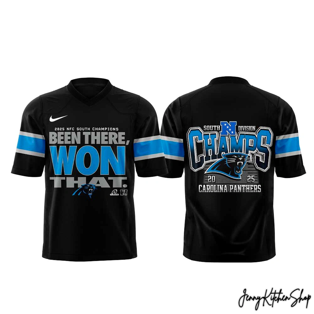 - The “Been There, Won That” Edition: This variant proudly proclaims “2025 NFC SOUTH CHAMPIONS” in a clean, impactful font above the truly audacious declaration: “BEEN THERE, WON THAT.” rendered in an oversized, dynamic typography. The “WON THAT” particularly stands out with its bold, almost three-dimensional effect, suggesting layers of hard-fought battles culminating in undeniable success. A sleek, subtle graphic of the team’s fierce panther head logo rests below, a silent growl of triumph. The overall impression is one of confident, unshakeable dominance, a direct challenge to any who might doubt the team’s prowess. A distinctive athletic emblem graces the upper left chest, a subtle nod to classic sports apparel design.