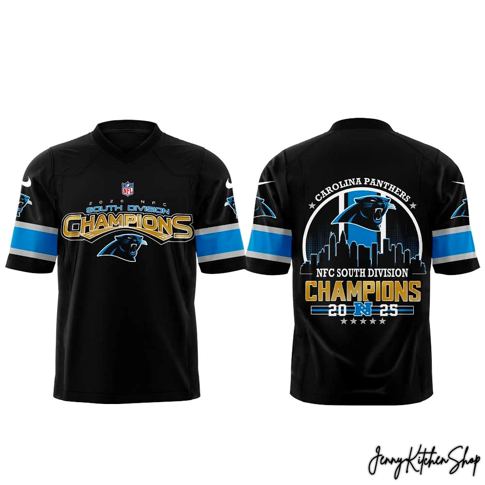 - The “SOUTH N DIVISION CHAMPS” Powerhouse: This variation features an enormous, stylized “CHAMPS” graphic dominating the upper back. The “N” within “CHAMPS” is subtly superscripted, clarifying “SOUTH DIVISION CHAMPS” with bold, blue, and white lettering that seems to leap off the black background. Below this colossal declaration, the snarling, powerful visage of the team’s panther logo takes center stage, framed by “20 25 CAROLINA PANTHERS.” This design screams aggressive victory, a visual roar that can be seen from the nosebleeds, embodying the raw power and unyielding spirit of the team.