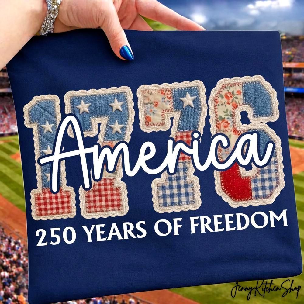 - Textual Elements: Phrases like “250 years of Freedom,” “Est. 1776,” or other celebratory slogans are integrated, often in vintage-inspired typography that feels both classic and contemporary.