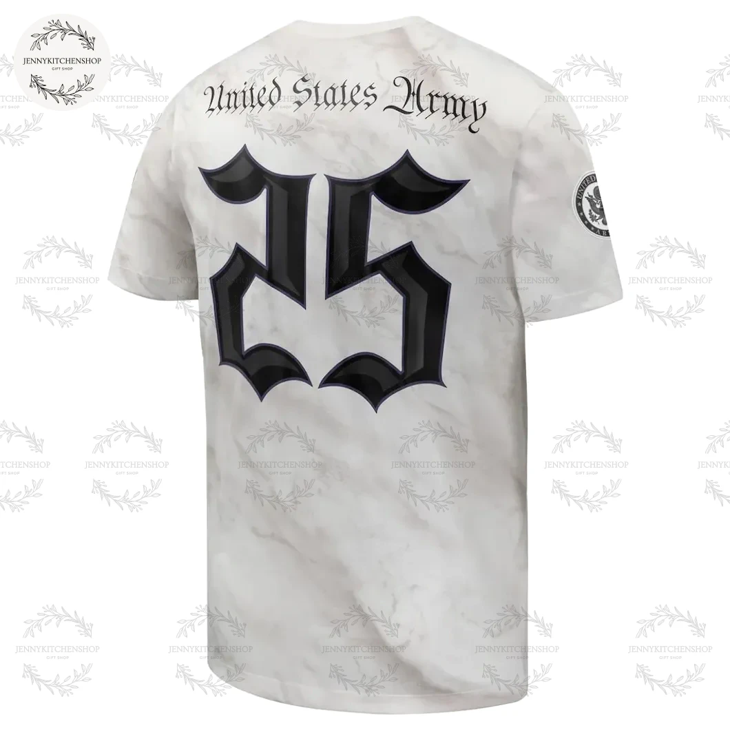 Above the magnificent “25” on the back, etched in the same distinguished Old English script, reads “United States Army.” This isn’t just text; it’s a declaration, a statement of unwavering pride and identity. Its placement and font reinforce the deep reverence and respect commanded by the institution.