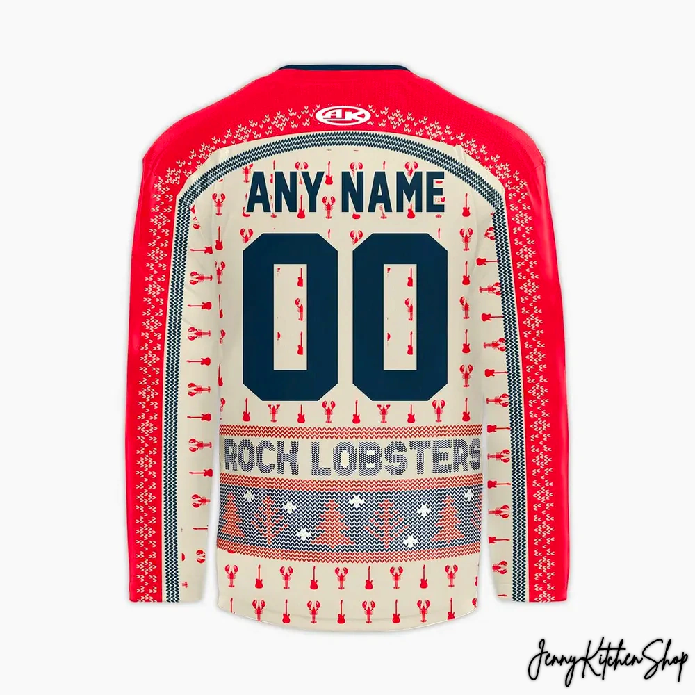 Along the bottom hem, a distinct “ugly sweater” knit pattern unfolds, a true testament to the designer’s creative process. Here, “ROCK LOBSTERS” is woven into the fabric, flanked by charming white stars and evergreen Christmas trees. This pattern isn’t just printed on; it’s designed to mimic the texture and homey feel of a traditional holiday sweater, creating a truly immersive aesthetic. The integration of the team name within this festive pattern makes it clear: this is a holiday piece specifically for our team, standing head and shoulders above generic holiday sports apparel. It’s a bold choice that truly makes this jersey a collector’s item.