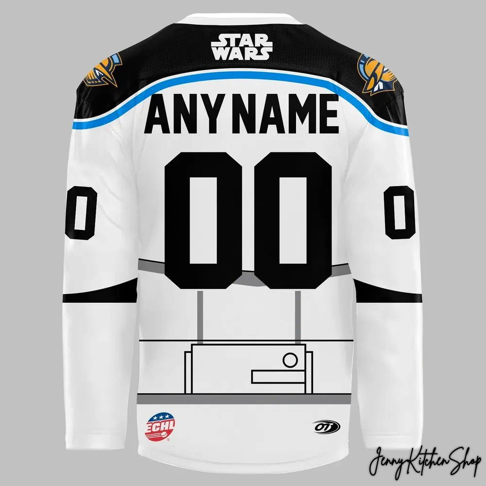 Turn to the back, and the saga continues. Boldly emblazoned at the top, just below the collar, is the legendary “STAR WARS” logo, leaving no doubt about the cosmic allegiance. Below, your chosen name and number stand out in striking black, allowing you to truly personalize your piece of the Empire. The Stormtrooper armor design extends flawlessly to the back, detailing the spine and lower back plating, ensuring a consistent, powerful visual from every angle. The sleeves feature matching Stormtrooper arm guard details, with the jersey numbers “0” (or your custom digit) prominently displayed. At the bottom, proudly sits the ECHL logo, grounding this intergalactic masterpiece firmly in the spirit of minor league hockey. Unlike generic themed jerseys that might simply put a character on a shirt, this design completely transforms the jersey into the character’s armor, offering an immersive experience that most competitor apparel simply cannot match. It’s a testament to team heritage and cultural significance, making the fan part of the story.