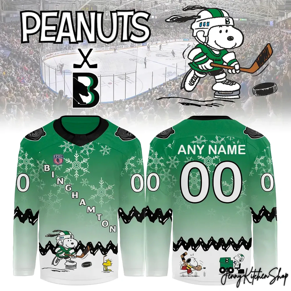 This jersey is ideal for Binghamton Black Bears hockey fans, Peanuts enthusiasts, collectors of unique crossover merchandise, and anyone who appreciates fun, nostalgic, and well-designed fan apparel that stands out from the crowd.