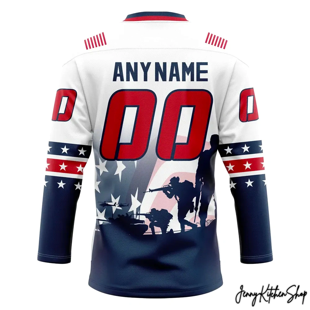 - Back Panel Narrative: The powerful military silhouette scene from the front continues seamlessly onto the back, ensuring the story of valor is told from every angle. This consistent narrative flow is a testament to the designer’s commitment to a cohesive and meaningful visual experience. Above this, the customizable “ANY NAME” and large, vibrant “00” in red stand ready to proudly bear the name and number of your choosing, making it uniquely yours.