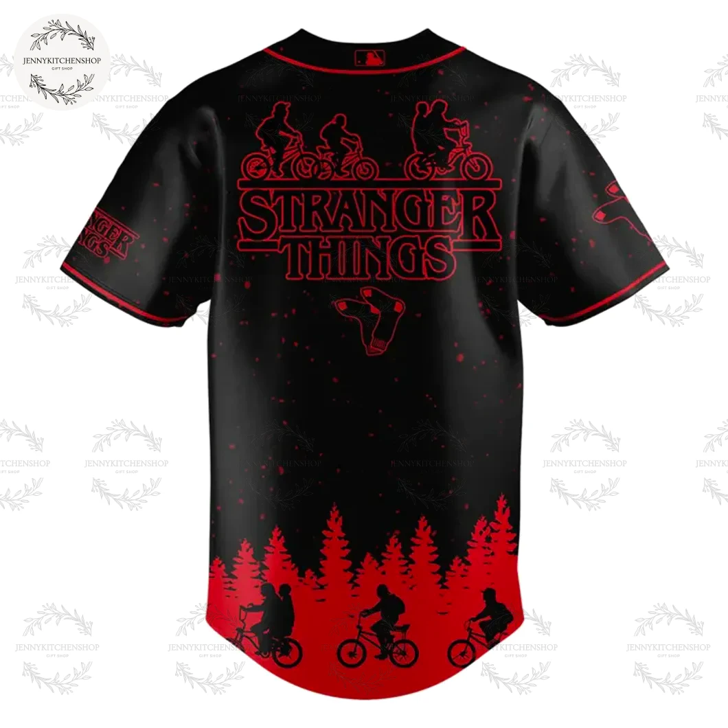 Look closer, and the jersey reveals even more layers. Scattered across the black fabric are subtle red speckles, like dust motes in a forgotten attic or the ethereal particles that drift through the Upside Down, adding a textural depth that’s both eerie and enchanting. But perhaps the most striking visual element lies at the hem: a vibrant red landscape of stylized pine trees, forming a dense forest silhouette. Against this backdrop, several silhouettes of kids on bicycles are depicted, capturing one of the most iconic images from the show – the camaraderie, the urgency, and the adventure of navigating secrets on two wheels. This isn’t a simple graphic; it’s a narrative panel, grounding the jersey in the thrilling escapades of the ’80s gang.