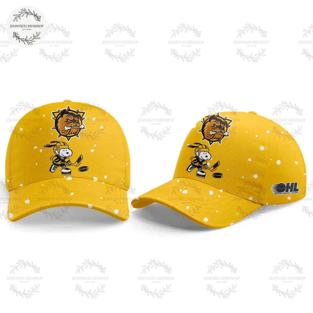 The uniqueness lies in its authentic crossover design, blending the aggressive Brantford Bulldogs mascot with the beloved, playful Snoopy character dressed as a hockey player. The golden yellow base with snow-like speckles and the visual storytelling of Snoopy on a white “ice rink” panel create a distinctive aesthetic that stands out from typical team merchandise. It’s a designer’s vision of merging sports intensity with nostalgic charm.
