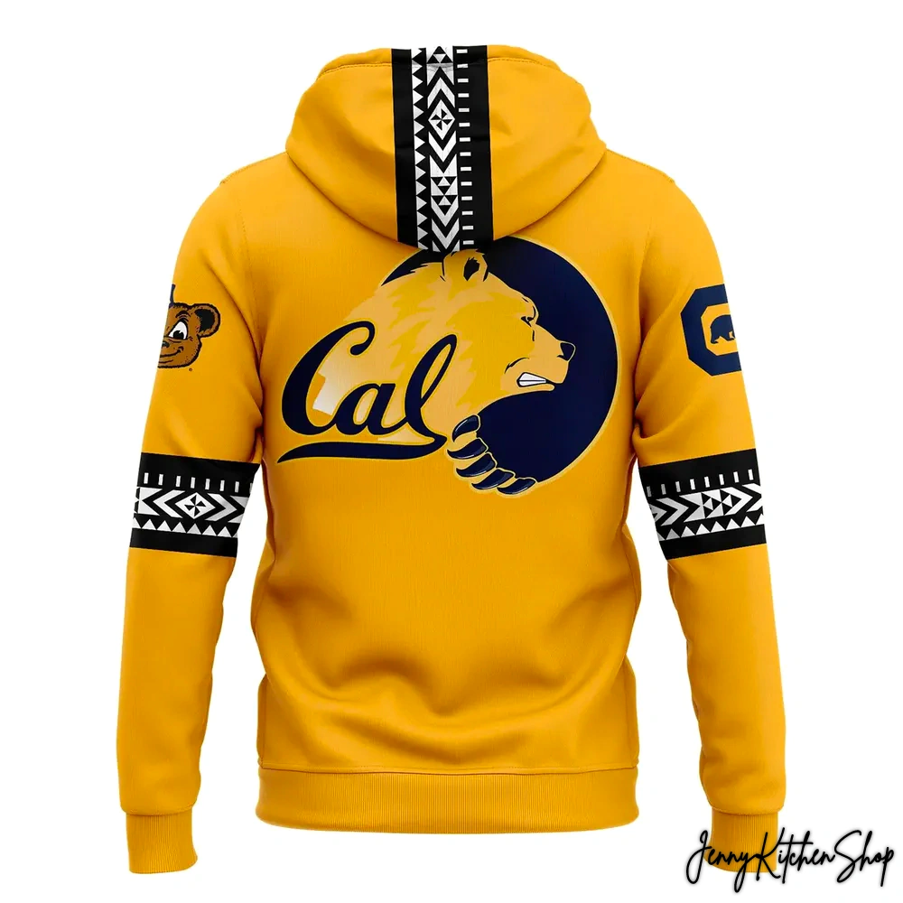 Flanking this magnificent bear on the back of the sleeves, you’ll find two more iconic Cal symbols: a larger-than-life “C” on the left sleeve and our beloved bear cub mascot on the right. These elements provide traditional Cal identity, anchoring the unique Hawaii Bowl design in our rich university heritage. And just like the front, the hood features a continuation of those striking black and white tribal patterns, running seamlessly down the center seam, tying the entire design together with a distinctive flourish.