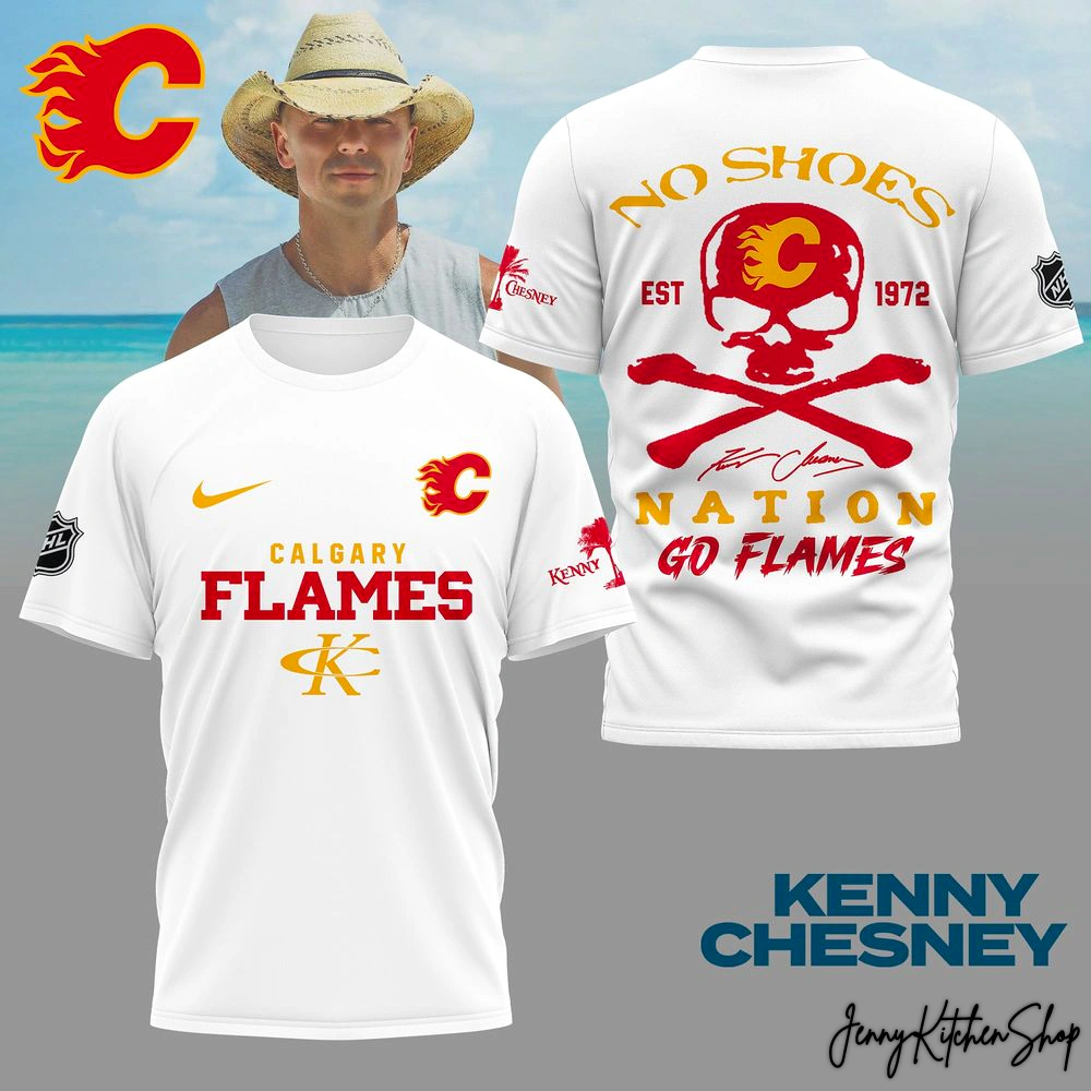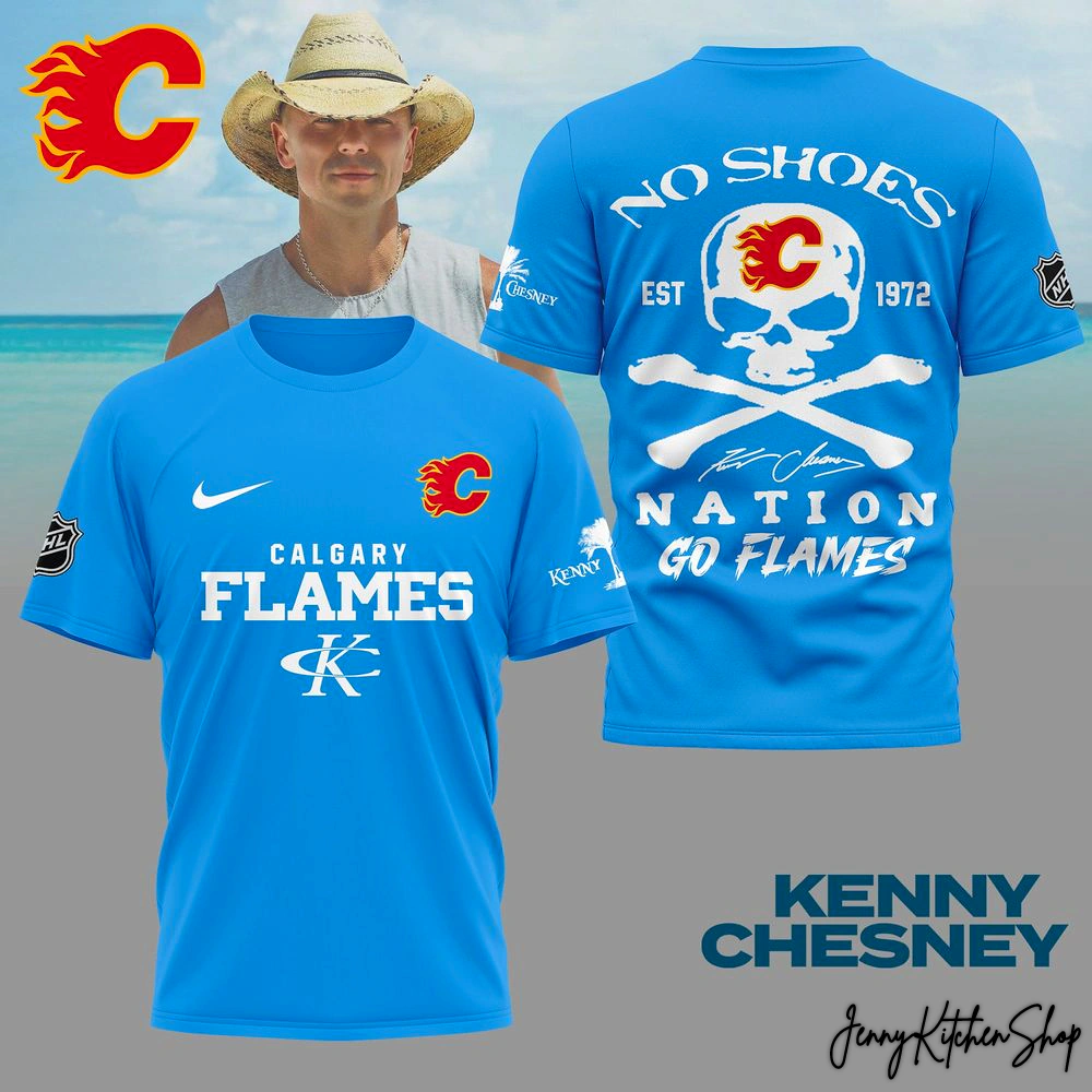 This isn’t just a shirt; it’s a meticulously crafted visual narrative that tells the story of an uncompromising fan. The front of the tee immediately signals dual allegiance with the iconic Calgary Flames “C” and its blazing flame, proudly sitting above the bold “CALGARY FLAMES” lettering, all rendered in a vibrant gold that pops against the shirt’s core colors (available in classic Red, crisp White, sleek Black, and refreshing Blue). Below, Kenny Chesney’s distinctive “K” — a subtle nod that true fans will instantly recognize — seamlessly integrates into the composition, symbolizing the convergence of two worlds. A sleek athletic checkmark near the collar hints at peak performance, while the official hockey league shield on one sleeve and Kenny’s signature palm tree logo on the other underscore the authenticity of this incredible fusion.