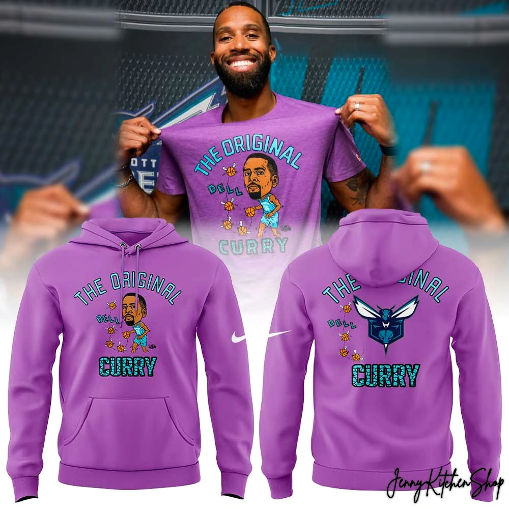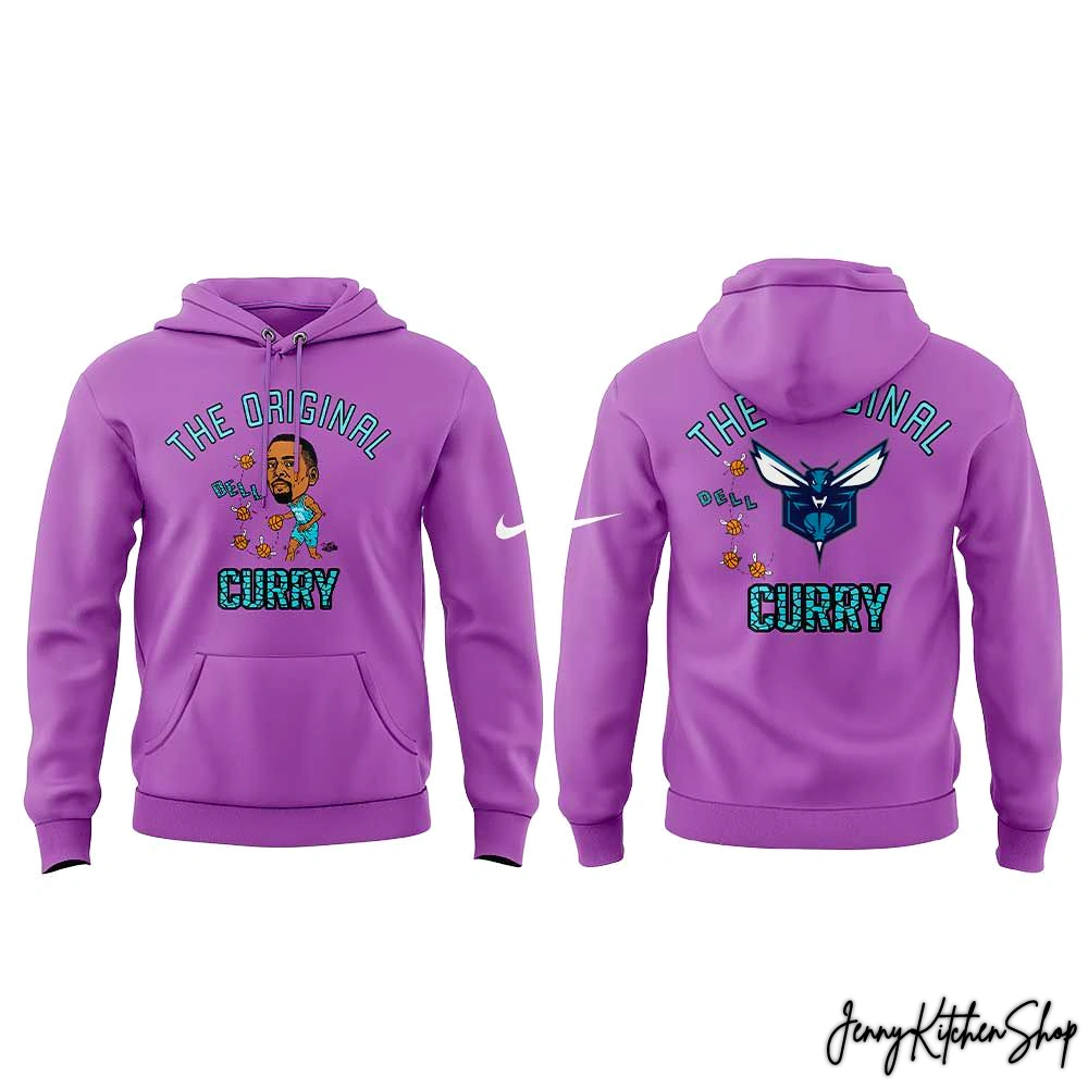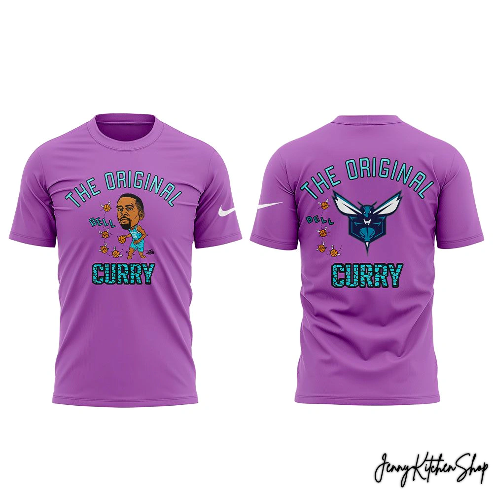 A Statement from Every Angle: The design doesn’t stop at the front. The back features the fierce, modern Hornets logo, flanked by the same buzzing “DELL” basketballs and the “THE ORIGINAL CURRY” text. It ensures your message of fan loyalty is seen coming and going.