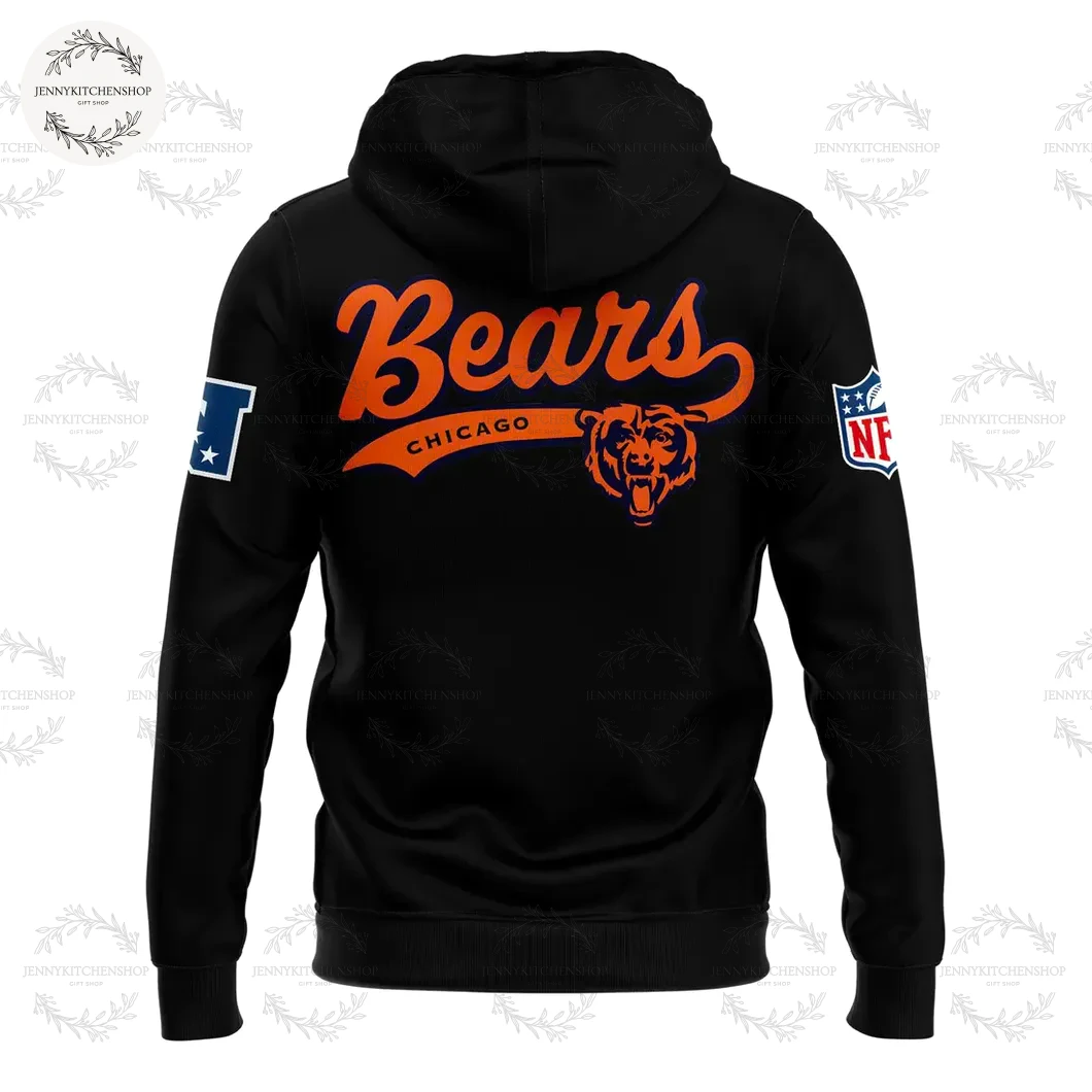 - The Back – Classic Roar: Turn around, and the statement continues with equal power. Across the upper back, a beautiful, flowing script proudly spells out “Bears” in that iconic orange. Beneath it, in a slightly smaller, clean white font, sits “CHICAGO,” grounding the passion firmly in our beloved city. And bringing it all together, nestled perfectly below “CHICAGO,” is the fierce, unmistakable head of the bear mascot, rendered in a powerful orange outline. This isn’t just a logo; it’s the face of our enduring strength, our legendary grit. This classic yet dynamic arrangement captures the heritage and fierce loyalty that defines our fanbase, a level of graphic storytelling that often feels absent in other products which tend to rely on singular, static emblems.