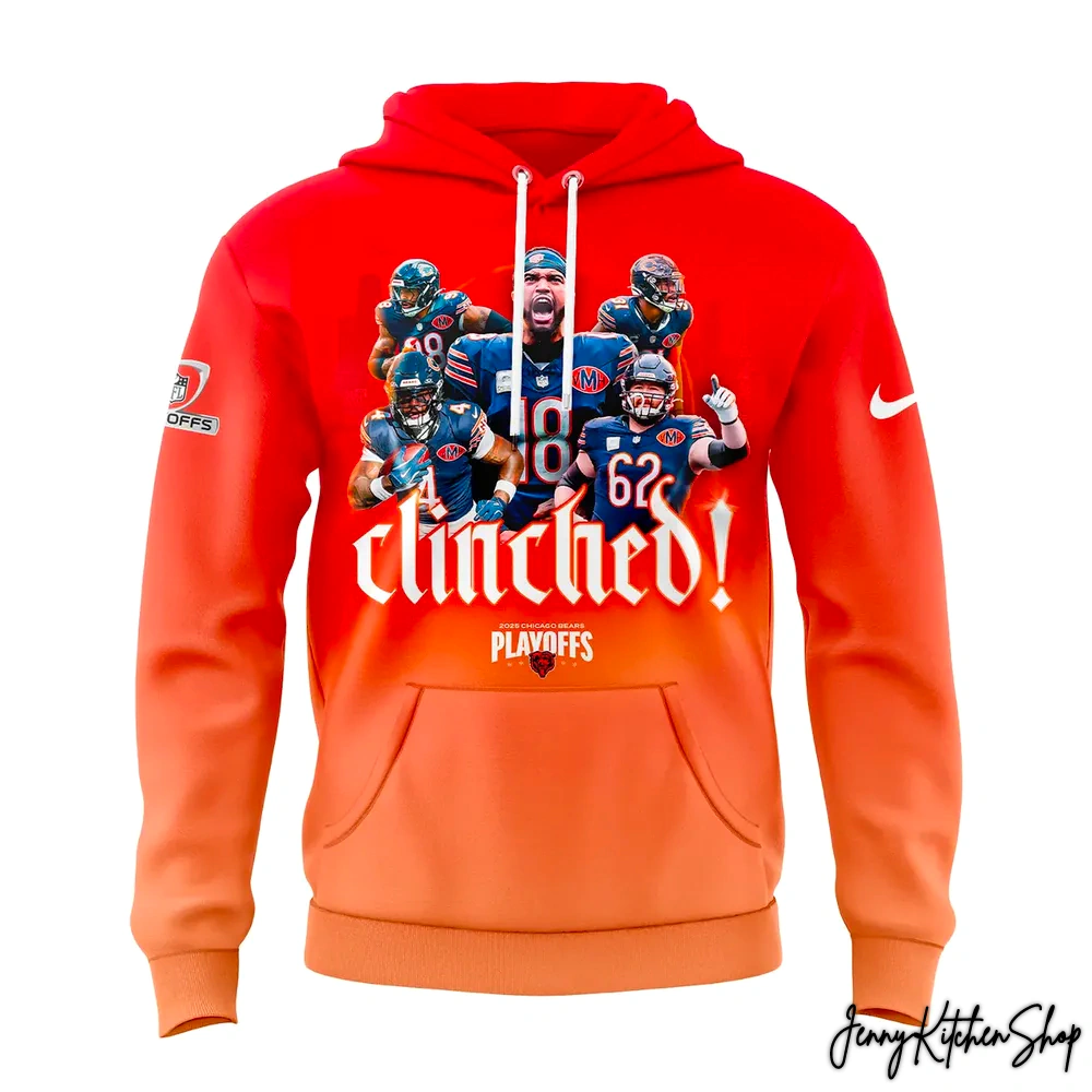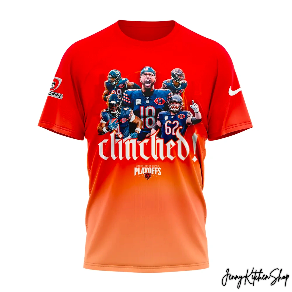 The “Clinching” Moment: Emblazoned across the chest in a striking, classic typeface is the word “clinched!” in brilliant white. The distressed, bold lettering gives it a vintage yet powerful feel, evoking the historic significance of securing a playoff berth. Below this triumphant declaration, subtle text notes “2025-2026 Chicago Football” and “PLAYOFFS” with a stylized, fiery graphic, firmly setting the stage for the future glory this piece celebrates. My vision here was to crystallize that exact moment of knowing, of securing that spot, making it timeless.