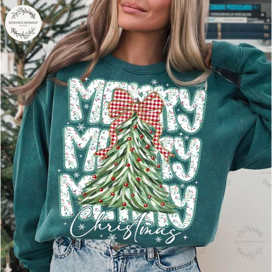 The rich, deep red of the garment itself serves as the perfect canvas, a warm, inviting hue that instantly conjures images of holiday cheer, Santa’s sleigh, and glowing fireplaces. This vibrant backdrop makes the intricate details of the floral MERRYs, the green tree, and the plaid bow truly pop, ensuring the design is not just seen, but felt.