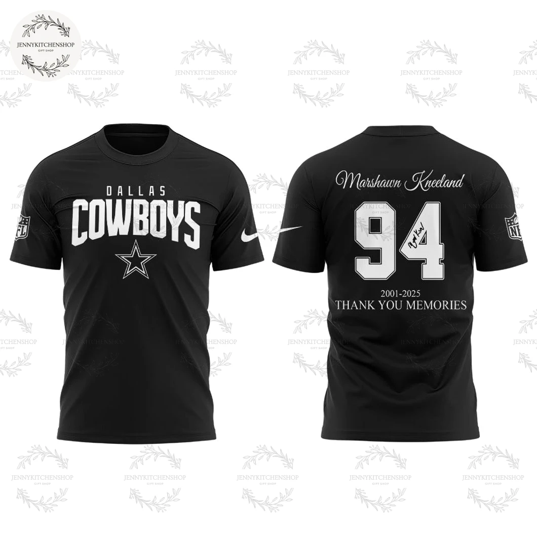 • The Reverent Reverse: A Story of Gratitude and Memory. Turning the garment reveals the heart of the tribute. At the very top, “Marshawn Kneeland” is rendered in an elegant, flowing script font. This choice of script over block letters adds a personal, almost handwritten touch, as if Marshawn himself has signed this testament to his journey. Below his name, the number 94 dominates the back – bold, strong, and undeniably impactful. This isn’t just a number; it’s a banner, representing his presence, his role, and the plays that defined his time with the Cowboys. A unique, almost calligraphic flourish, a stylized signature detail, is subtly integrated within the ‘4’ of ’94’. This small, personal touch is what elevates this design from mere merchandise to a bespoke keepsake, reflecting the individuality of the player and the designer’s commitment to authentic detail. Below the number, the dates “2001-2025” are displayed, a chronological marker that invites reflection on his life and time. And beneath that, the poignant phrase “THANK YOU MEMORIES” in strong, clear capital letters. This isn’t a simple goodbye; it’s an embrace of all the moments, the plays, the spirit, and the lasting impact Marshawn Kneeland has left on the Dallas Cowboys faithful. The league shield is mirrored on the back, reaffirming the authenticity of this commemorative Cowboys fan gear. My intention with this back design was to create a powerful yet respectful statement, celebrating a player’s journey and giving voice to the collective gratitude of the fan base. Competitors often miss these layers of personal narrative, opting for generic text; here, every font, every placement, every detail serves the overarching story.