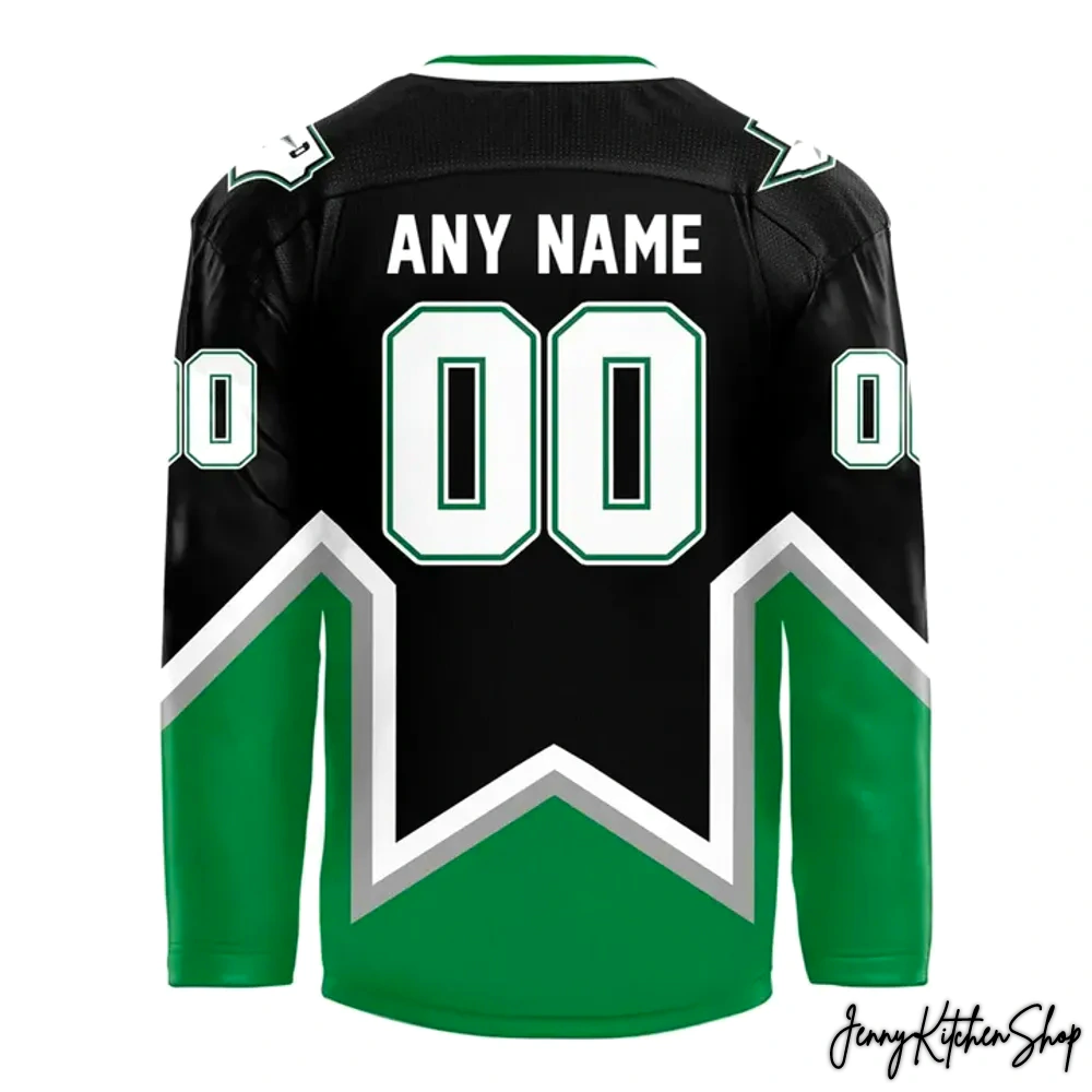 • The Silver Starlight Front and Center: Across the chest, “DALLAS STARS” is emblazoned in a sleek, modern silver text, sitting proudly above a massive, five-pointed green star. This isn’t a small logo tucked away; it’s a declaration, bold and unmissable, symbolizing the bright future and the strength of the team. The designer’s intention here was to create a focal point that instantly commands attention, mirroring the star power of our players on the ice.