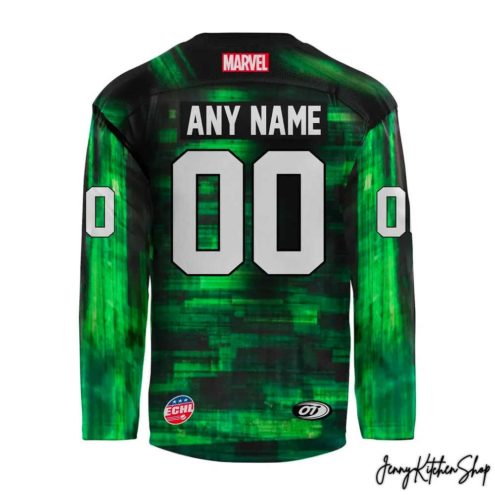 Cast your eyes on the commanding presence of this Florida Everblades 2026 Marvel Super Hero Hockey Jersey. The moment you see it, you’re hit by a potent blend of raw hockey energy and formidable comic book power. At its heart, front and center, stands none other than Doctor Doom, ruler of Latveria, in his iconic armored glory and flowing green cape. This isn’t a mere cartoon; it’s a rendition that captures his gravitas, his calculated menace, his absolute authority. The designer’s intent here was brilliant: to take the Everblades’ vibrant green and infuse it with Doom’s signature emerald and a deep, shadowy black. This fusion creates a dynamic, almost digital “glitch” pattern that pulses across the sleeves and body, suggesting the powerful, disruptive force Doom represents – a true supervillain on the ice.