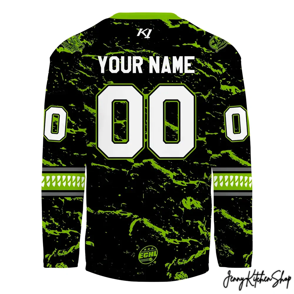 - The Iconic Everblades Crest, Reimagined: Dominating the front is the legendary Florida Everblades alligator logo, rendered in its classic grey, white, and neon green hues. But against this “Swamp Static” background, the gator seems to spring forth, teeth bared, eyes gleaming with predatory intent. The neon green outlining the logo ties it seamlessly into the jersey’s electrifying theme, ensuring our beloved mascot is not just present, but commanding. The designer painstakingly ensured the logo maintained its iconic strength while perfectly integrating into this bold, new aesthetic.