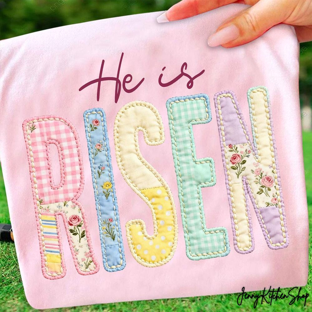 Let’s craft a product description that truly resonates with fans and makes this “He Is Risen” Christian Easter Faux Quilt Patchwork Graphic T-Shirt a must-have!