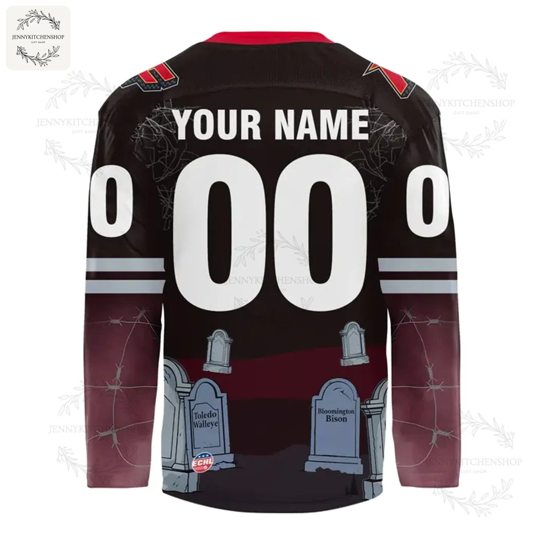Look closely at the design: the iconic Indy Fuel logo front and center, bold as ever. But down below, that’s where the real fun begins. A chilling graveyard scene, complete with tombstones featuring our rivals – Toledo Walleye, Bloomington Bison – a playful, spooky shout-out to the ECHL battles we love to win. And that skeleton hand clutching a stick? Pure Hocktoberfest gold, embodying the spirit of burying the competition. Unlike those cheap screen-printed jerseys that crack and peel after a few washes, this Spooky Special is printed to your exact design specification before being precisely cut and sewn. That means every spiderweb detail, every tombstone, every custom “YOUR NAME” and “00” on the back is vibrant, crisp, and perfectly aligned, built to last. The refined red collar gives it that authentic hockey look, while the fit is designed for mobility in the shoulders and torso – perfect for throwing your hands up after a Fuel goal or just moving comfortably around town. Durable stitching and excellent color integrity ensure this jersey stays looking sharp for seasons to come. It’s available in Men S-5XL, Women S-2XL, and Youth S, L, ensuring every member of the Fuel faithful can join the fun.