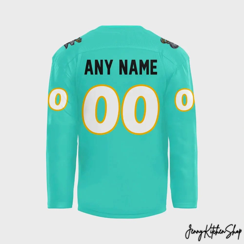 Step onto the ice (or into the arena, or your living room) with a jersey that’s as unique and spirited as your dual passions. This isn’t your everyday fan gear; it’s a masterclass in crossover design, born from the creative mind of a designer who truly understands the pulse of both sports and pop culture. From the moment you lay eyes on it, the vibrant, refreshing aquamarine base color instantly grabs your attention – a shade that perfectly echoes the underwater world of Bikini Bottom while standing out brilliantly in any hockey crowd.
