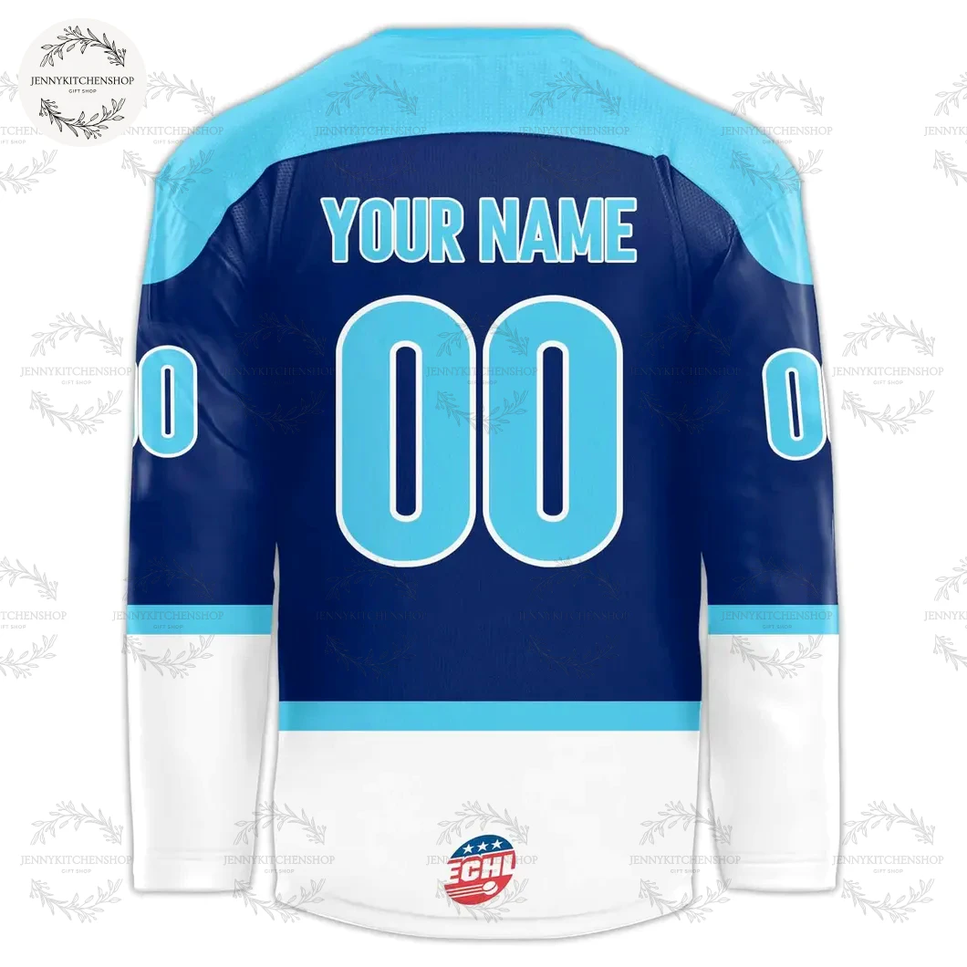 Compared to typical fan apparel which often offers basic screen prints and limited design depth, this jersey prioritizes visual impact and fan connection. The rich, layered color scheme, the intricate detailing of the Iceman mascot, and the opportunity for deep personalization reflect a designer’s commitment to creating a truly premium and authentic fan experience. Every line, every shade was chosen to evoke the heritage of Jacksonville hockey and the vibrant energy of the ECHL, making this piece a visual symphony of our team’s identity.