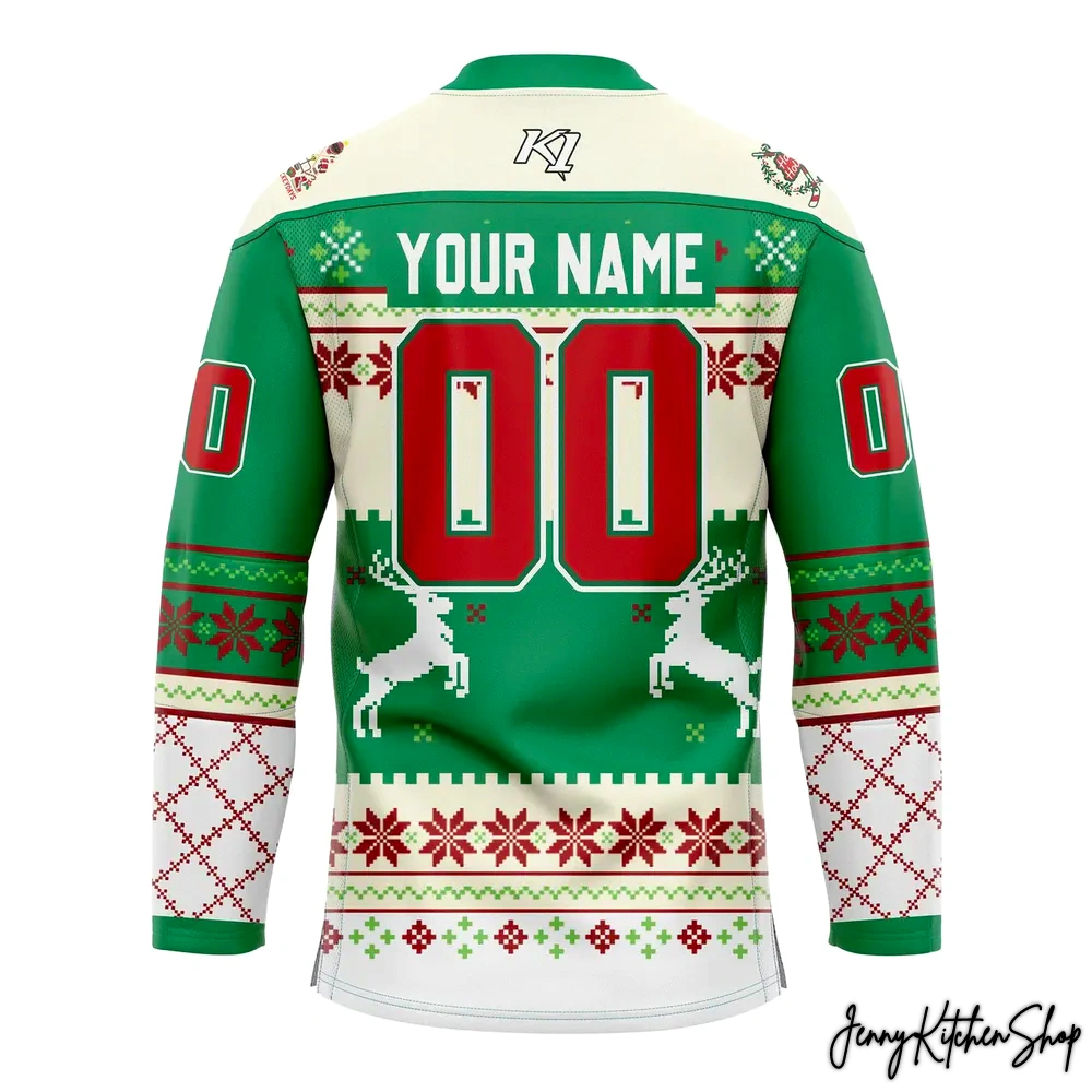 • The Festive Foundation: The jersey’s primary canvas is a rich, forest green, immediately evoking the classic hues of the holiday season. This deep green is perfectly complemented by striking cream-colored panels on the chest and sleeves, creating that quintessential “ugly sweater” backdrop. Our designer deliberately chose this color palette to resonate with timeless holiday traditions while maintaining a vibrant, energetic feel fit for the ice.