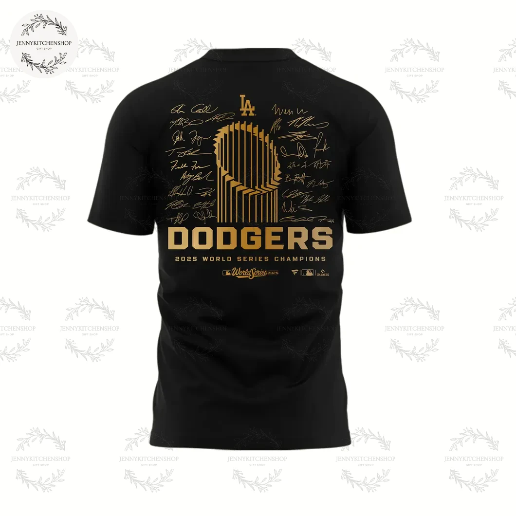 Our design philosophy was clear: to create something truly exceptional. We wanted to move beyond the typical, often generic, championship shirts that simply stamp a logo and year. This piece is a carefully curated work of art. The deep, rich black fabric serves as the perfect canvas, allowing the radiant gold print to pop with an almost three-dimensional quality, ensuring that your statement of unwavering faith is seen from every angle. The integration of the “LA” within the trophy, the bold “Champions” script, and especially the player signatures, are elements rarely combined with such thoughtful artistry in competitor offerings. This isn’t just merchandise; it’s a piece of future history, a wearable prophecy for the true believer who understands that being a fan is about more than just cheering—it’s about unwavering belief and anticipation.