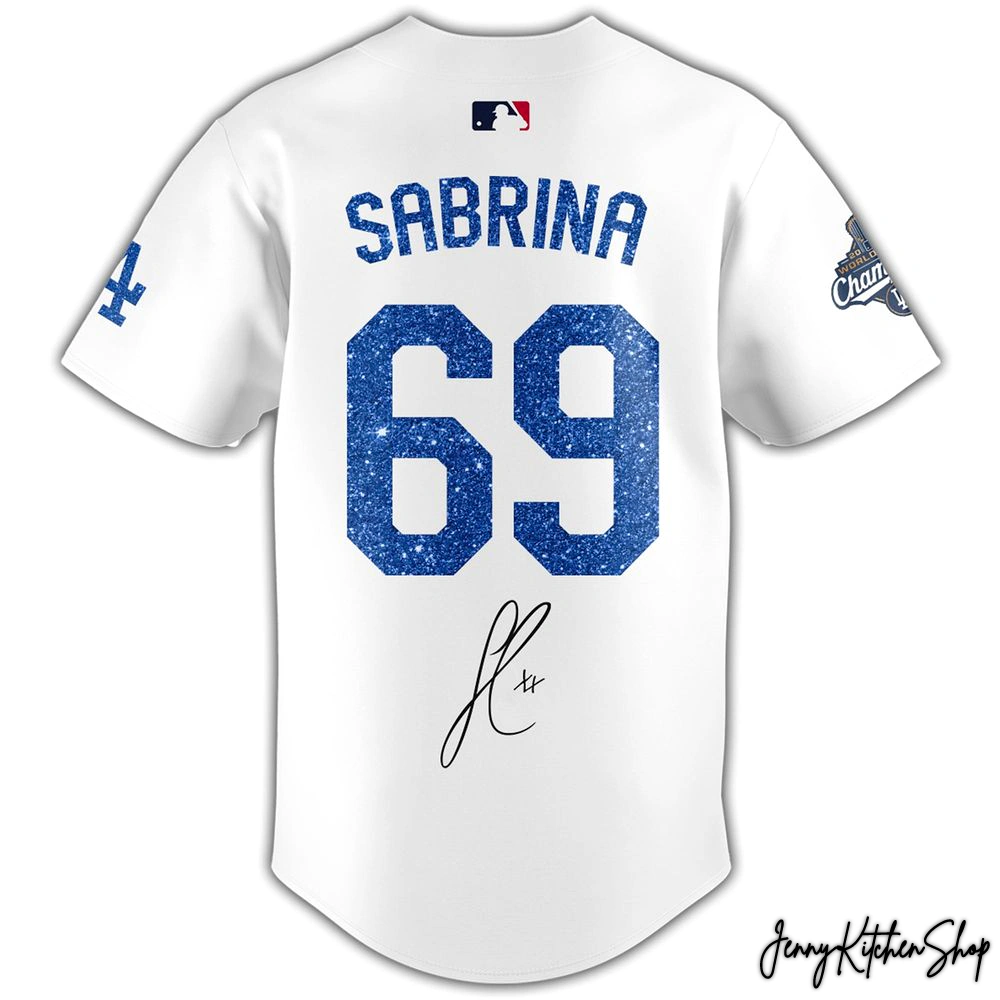 Imagine wearing this to Dodger Stadium, the red glitter lips and number “69” catching the sunset, drawing admiring glances from fellow fans who appreciate a fresh take on team pride. Or picture yourself front row at a Sabrina Carpenter concert, the blue glitter “SABRINA” and “69” shimmering under the stage lights, a direct connection to the artist’s own audacious style. This fan jersey is designed to embody that dual spirit, making you feel authentically connected to both worlds.