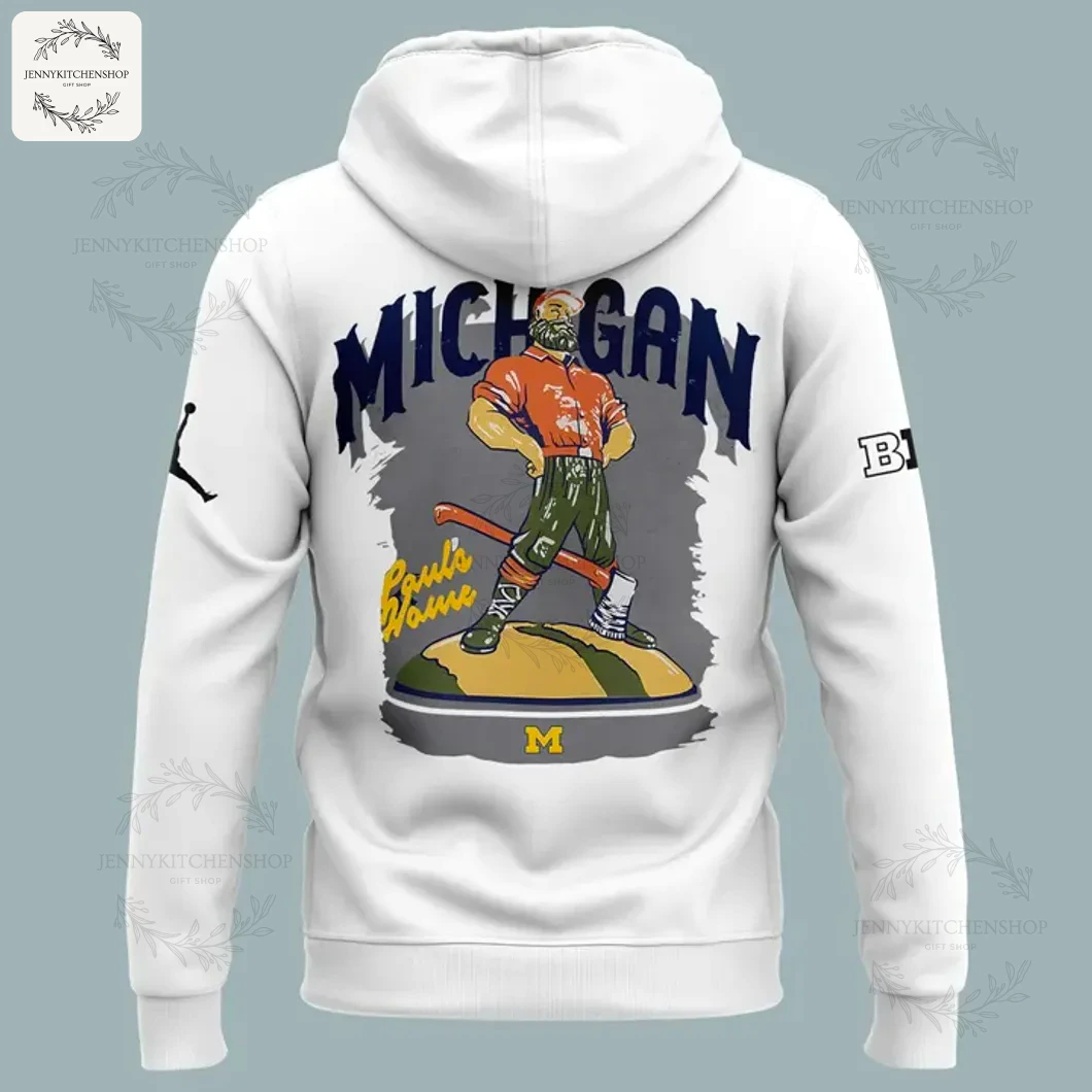 This isn’t just another layer; it’s a meticulously crafted tribute to one of college football’s fiercest rivalries, designed with both the passionate fan and practical utility in mind. The front of the hoodie proudly features Paul Bunyan, reimagined as a dedicated Michigan fan, confidently standing between the iconic helmets of both Michigan and Michigan State. His legendary axe is at the ready, symbolizing the perpetual battle for the Paul Bunyan Trophy since 1953. The artwork is bold, rich in color, and immediately recognizable, ensuring your loyalty is unmistakable. Turn around, and the back features a striking “MICHIGAN” graphic, with Paul Bunyan presented from behind, his axe emblazoned with “Paul’s Home,” resting on a subtle “M” logo, reinforcing the undeniable connection to the Wolverines. Look closer, and you’ll find a subtle Jumpman logo and Big Ten branding discreetly integrated into the design, affirming its place within official fan culture.