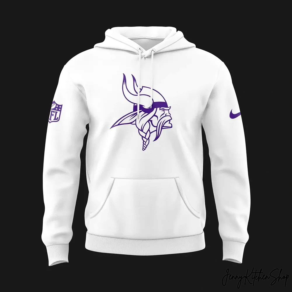 From the moment you lay eyes on it, the striking visual appeal is undeniable. The core of this hoodie’s design is the bold, iconic Viking head logo, rendered in a rich, vibrant purple outline, positioned proudly at the center front. This isn’t just any emblem; it’s the fierce, horned visage that has inspired generations of fans, a symbol of strength, resilience, and unwavering spirit. Against the pristine, snow-white backdrop of the hoodie, this purple outline truly pops, creating a powerful contrast that demands attention and unequivocally declares your allegiance. It’s a clean, sharp execution that elevates the legendary symbol, allowing its intricate details – from the braided beard to the majestic horns – to be appreciated anew.