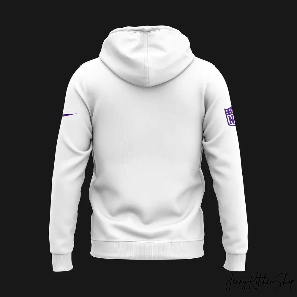 Beyond the central masterpiece, subtle yet significant details reinforce the authenticity and athletic spirit of this hoodie. On the left sleeve, near the cuff, you’ll find the authentic, officially recognized NFL shield logo in coordinating purple. This small but mighty detail serves as a seal of quality and genuine connection to the league. Complementing this, on the right sleeve, a sleek, athletic-inspired swoosh-like emblem, also in purple, adds a touch of dynamic flair and acknowledges a commitment to performance and modern design. These elements are strategically placed, adding depth without cluttering the clean, minimalist aesthetic of the white fabric.