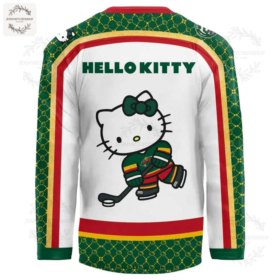 Every Minnesotan knows that crisp autumn air, the scent of woodsmoke, and the anticipation building as hockey season gets into full swing. Picture this: it’s Hello Kitty Night at The Xcel, and you’re walking in, not just sporting your usual green and red, but rocking something truly special, something that makes fellow fans do a double-take and smile. That’s the exact feeling this new Minnesota Wild x Hello Kitty Night Hockey Jersey evokes. The first thing that grabs you is Hello Kitty herself, stick in hand, completely kitted out in the Wild’s iconic green, red, and gold, ready to hit the ice. It’s not just a sticker slapped on a shirt; look closer, and you’ll see the subtle, repeating Hello Kitty pattern woven into the deep forest green panels on the shoulders and sides, a clever nod that blends the two worlds seamlessly. This isn’t some flimsy tee you’d wear to the lake; this is a premium pique fabric, a substantial 200gsm, robust enough for a proper jersey feel yet surprisingly soft to the touch. You can tell this isn’t an afterthought. The way the design flows seamlessly from front to back, the sharp lines of the white body meeting the bold Iron Range red and Harvest Gold stripes – that’s because the custom designs are printed directly into the fabric before the jersey is even stitched together, ensuring pristine continuity across every seam. I held this one up, and you can instantly feel the quality, the promise that this piece will stand up to many more seasons of cheering for the boys in green.