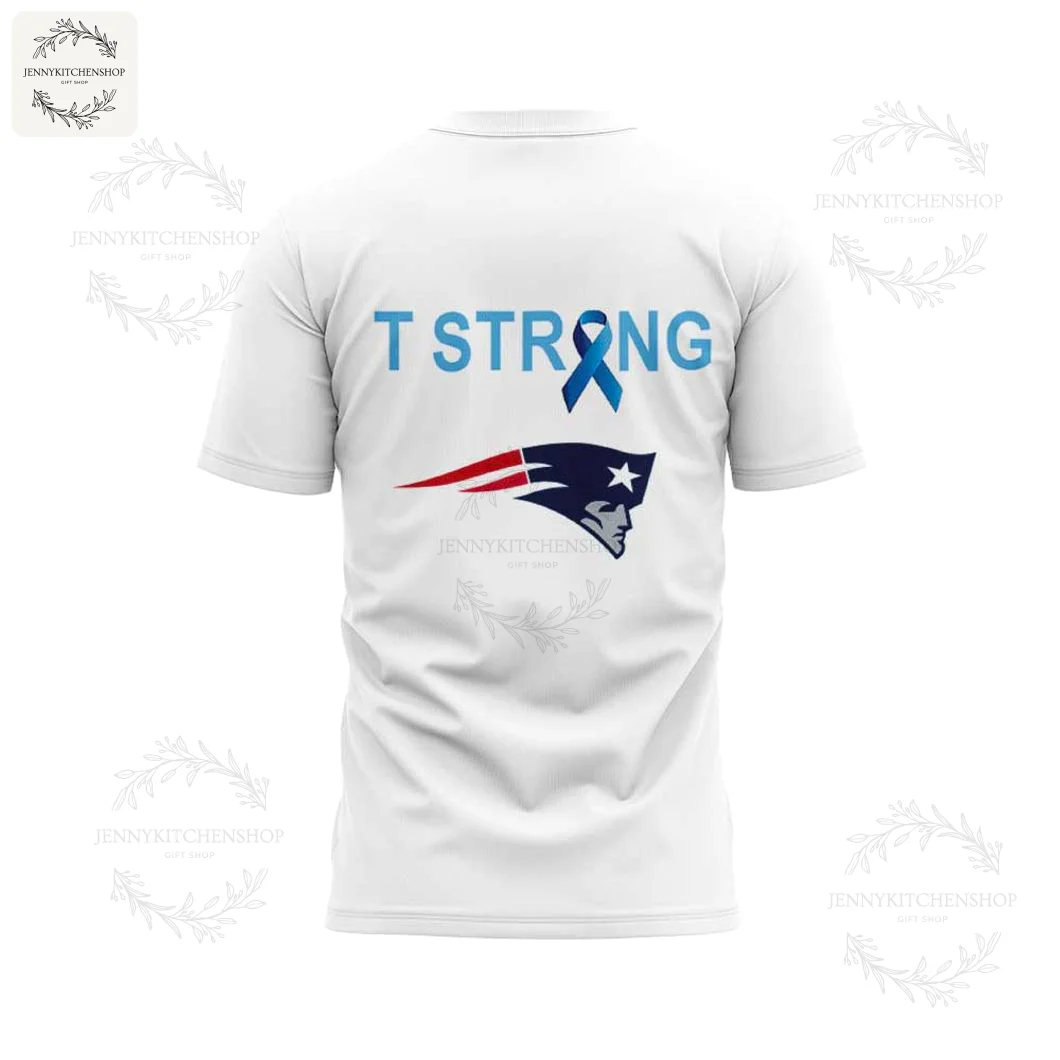 Collage showing players wearing the New England Patriots Rocking Strong shirt and detailed front and back views of the product.Front of the white New England Patriots t-shirt with T STRONG text and a blue ribbon with the team logo replacing the letter O.Back of the white New England Patriots t-shirt showing the T STRONG text and the stylized flying Elvis team logo below it.