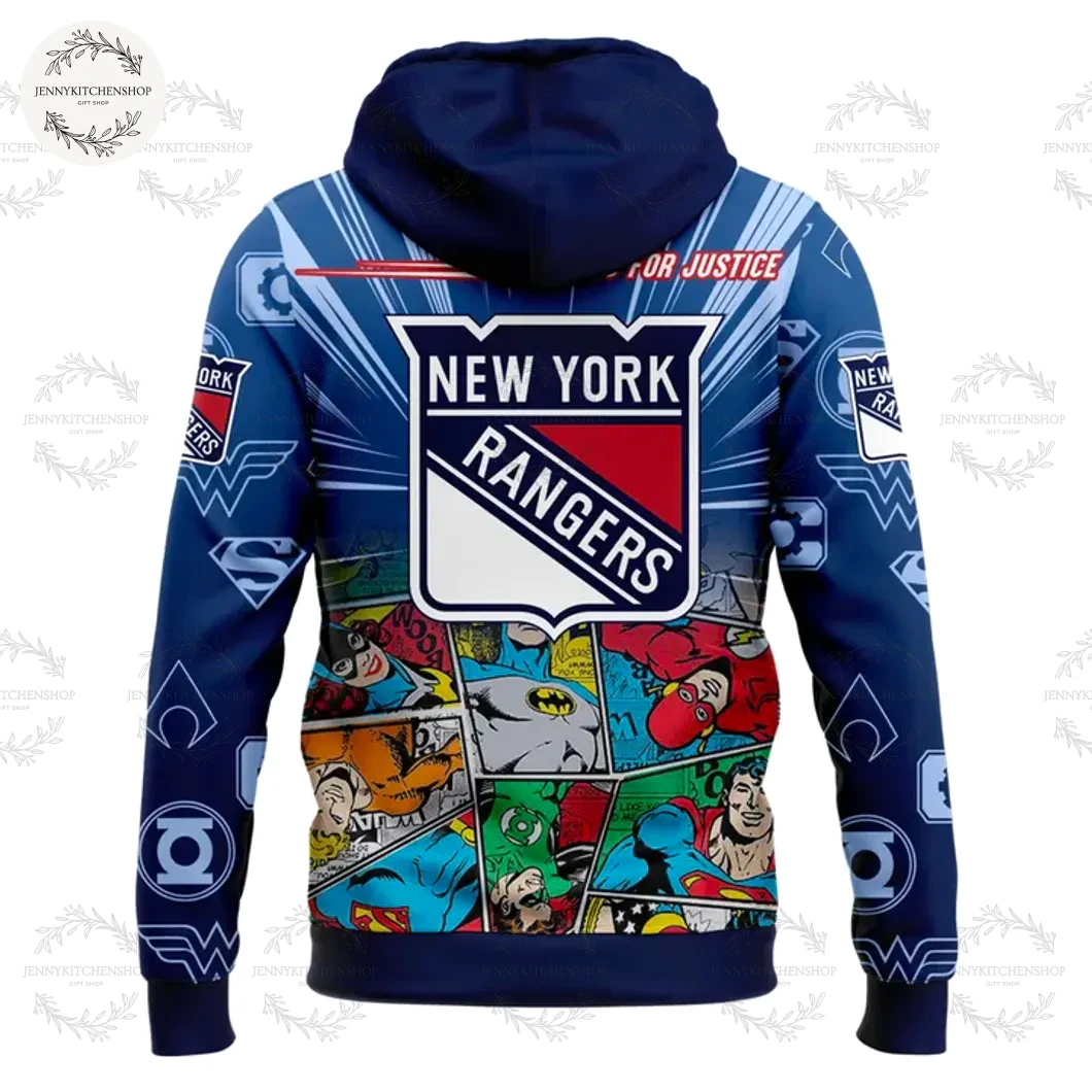 - Back: A Canvas of Comic Book Lore and Team Honor: Turn this extraordinary hoodie around, and you’re greeted by a spectacle of storytelling. The back proudly features the classic New York Rangers shield logo, a timeless symbol of hockey heritage and unwavering loyalty, positioned centrally and boldly. Above it, in a subtle yet powerful declaration, the words “FOR JUSTICE” serve as a unifying motto, bridging the worlds of sports and heroism. Below the Rangers shield, a vibrant, multi-panel comic book montage unfolds, capturing dynamic action scenes and beloved characters in a style reminiscent of classic comic art. This meticulously designed segment isn’t merely decorative; it’s a narrative journey, inviting you to relive epic tales and embrace the adventurous spirit that defines the DC universe. The designer’s inspiration here was to evoke the nostalgia and excitement of flipping through cherished comic pages, making the back a true tribute to storytelling and heroism. The entire composition is set against a backdrop of sweeping blue rays, mimicking the front’s energetic aura, ensuring a cohesive and visually arresting experience from every angle.