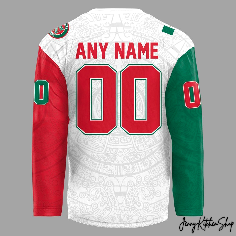 This jersey is a visual masterpiece, drawing deep inspiration from the artistry and symbolism of Mexican heritage. The striking color palette, featuring bold reds, whites, and blues, is interwoven with accents of vibrant emerald green and sunny gold, echoing the national colors and the festive spirit of celebration. Intricate patterns, reminiscent of Talavera tiles and traditional folk art, are subtly integrated into the design, offering a unique visual texture that tells a story with every stitch.