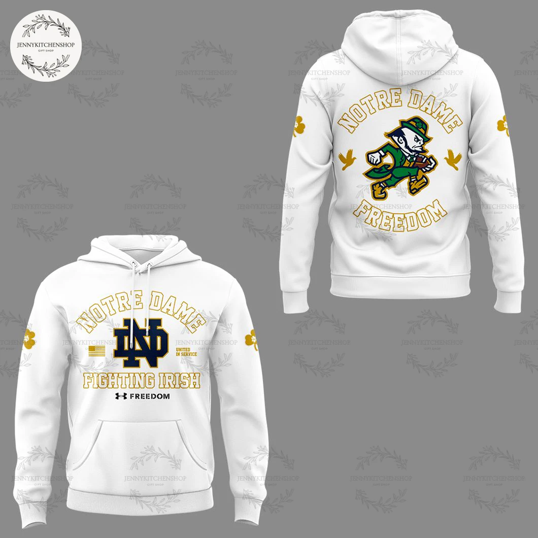 - Hoodie Back – The Unstoppable Legend, Unbound:* For the hoodie, I wanted a design that evoked dynamic energy and undeniable swagger. While “NOTRE DAME” arcs above, the central element is a vibrant, full-color depiction of our iconic leprechaun mascot, dashing forward with a football firmly tucked. Rendered in his traditional green, gold, and white, he’s a burst of energy, symbolizing the tenacious, never-say-die attitude that defines the Fighting Irish. This is a mascot with character, known worldwide. Below this spirited leprechaun, “FREEDOM” is proudly displayed in the golden, textured font. The two golden dove silhouettes from the T-shirt are also present, flanking the leprechaun, adding that touch of symbolic grace even amidst the action. This design ensures that whether you’re celebrating a win or facing a challenge, your spirit is visibly, undeniably Irish. It’s a playful yet powerful nod to our heritage that competitors often miss, opting for simpler, less characterful mascot representations.