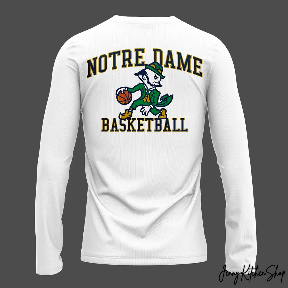 Imagine standing tall, ready for tip-off, your spirit charged with the power of the Golden Dome. This long sleeve shirt isn’t just white; it’s a canvas of pure devotion, meticulously designed to spotlight the fierce, unyielding energy of Notre Dame basketball. The crisp, clean white base immediately draws your eye to the undisputed star: our iconic Leprechaun mascot, caught mid-dribble, ready to dominate the court.