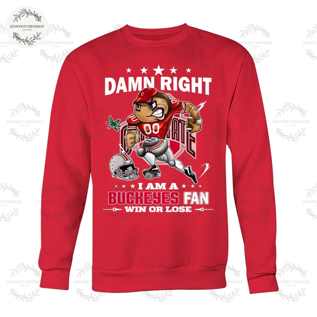 Above this animated display, five crisp white stars crown the bold, uppercase declaration: “DAMN RIGHT.” This isn’t just an affirmation; it’s a statement of unwavering confidence, an unapologetic assertion of your pride. It’s the conviction you feel when the Buckeyes make a crucial play, the knowing nod shared with fellow fans. Below the powerful character, three more stars flank the equally emphatic proclamation: “I AM A BUCKEYES FAN.” This isn’t a question; it’s a declaration. It’s the essence of your fan identity, etched in plain sight. And finally, underlined by elegant arrow-like flourishes, the ultimate pledge: “WIN OR LOSE.” This isn’t just a slogan; it’s the core tenet of true fandom, a promise of eternal loyalty that transcends the scoreboard.