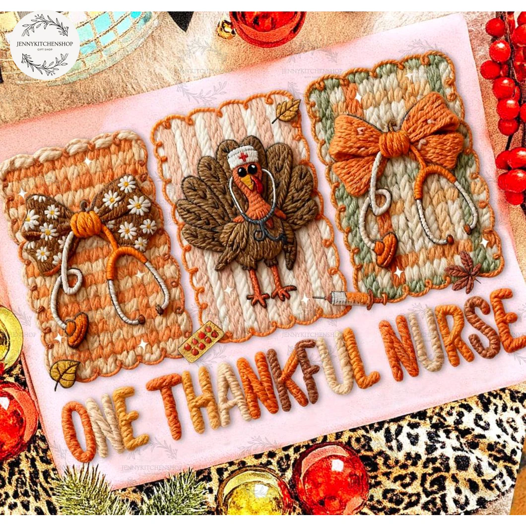 • The “ONE THANKFUL NURSE” Typography: Beneath these captivating panels, the phrase “ONE THANKFUL NURSE” emerges in a bold, chunky, and visually textured font. Each letter appears individually crafted, mimicking the warm, multi-tonal appeal of embroidered appliqué or cozy yarn. The gradient of autumnal oranges, soft tans, and creamy whites within the lettering not only enhances readability but also reinforces the cozy, artisanal feel of the entire design. This isn’t just text; it’s an integral part of the artistic expression, designed to feel as comforting and significant as the sentiment it conveys.