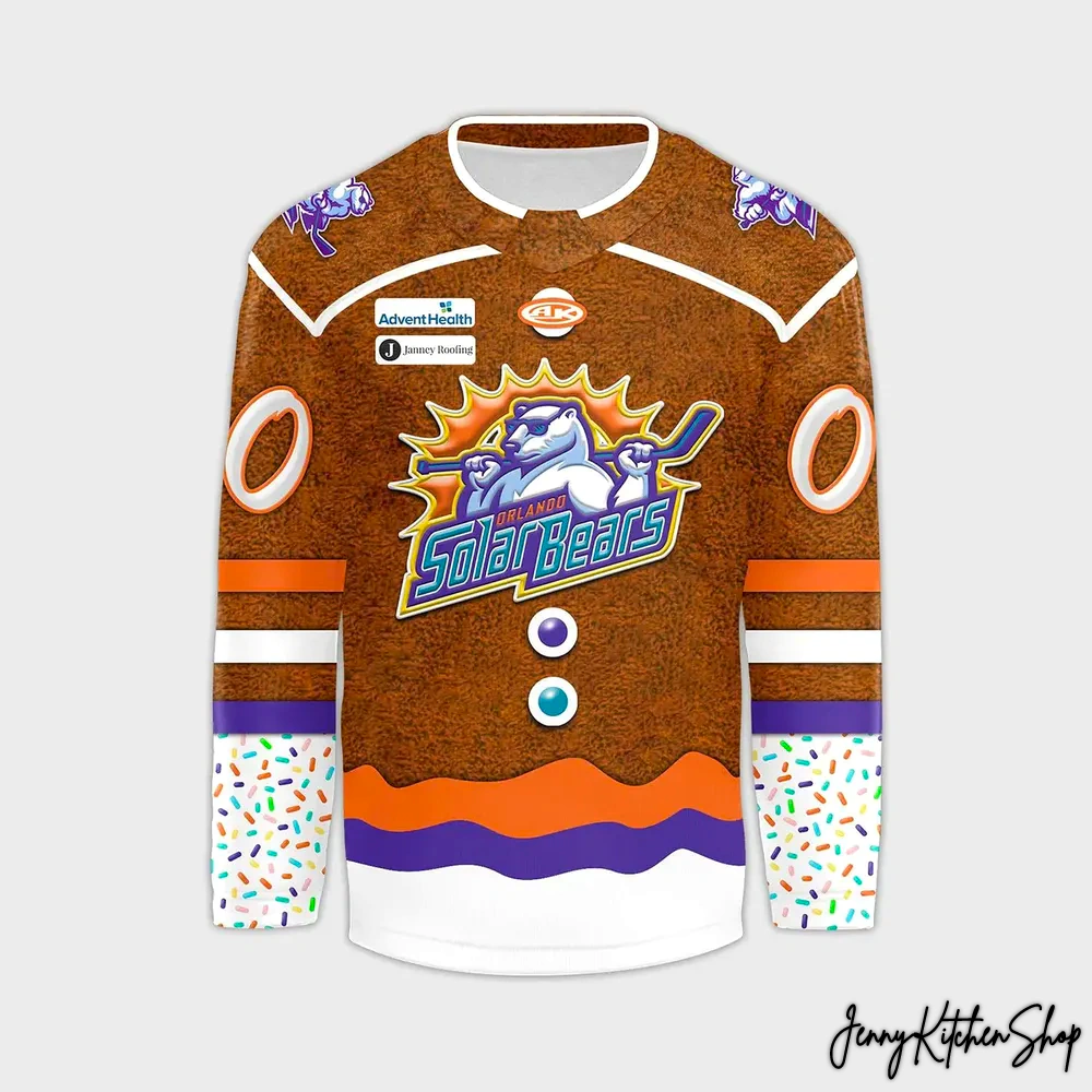 - Iconic Team Emblem: Nestled proudly on the chest is the legendary Orlando Solar Bears logo. The fierce polar bear, bathed in the glow of a vibrant sunburst, hockey stick in paw, stands out in vivid detail. This emblem isn’t just printed; it’s integrated seamlessly into the “gingerbread” backdrop, a testament to the team’s enduring legacy amidst the festive transformation.