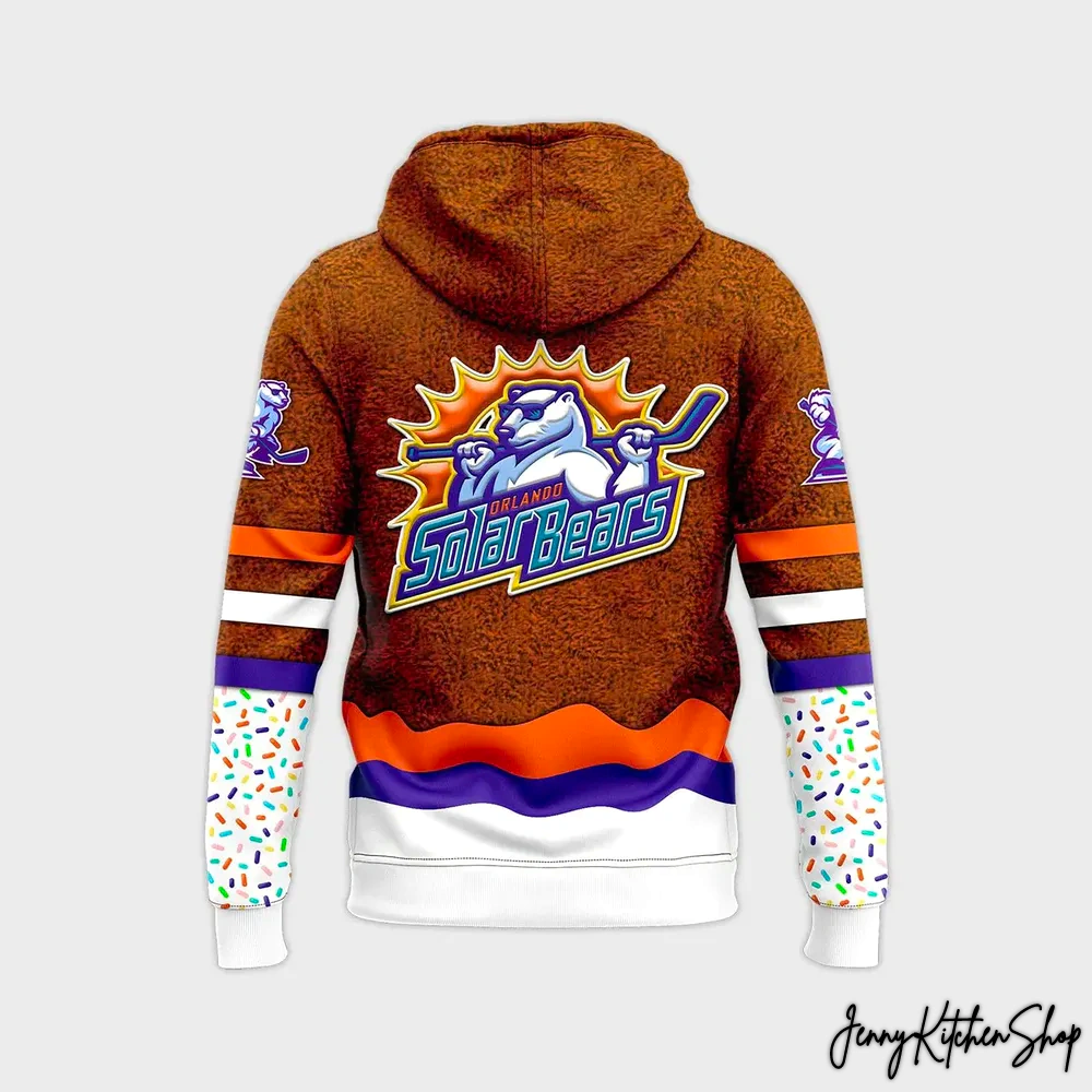 From the first glance, the body of this hoodie envelops you in a rich, inviting gingerbread brown texture. It’s not just a color; it’s a detailed, almost tactile print that mimics the cozy, slightly coarse look of a classic gingerbread treat, instantly evoking warmth and holiday comfort. This distinctive base sets it far apart from any standard team apparel, which often relies on flat colors. Centered proudly on both the front and back, the iconic Orlando Solar Bears logo shines. Our cool polar bear, stick in hand, is framed by a vibrant orange sunburst, perfectly capturing the team’s sunny Florida roots and explosive energy on the ice. The “Orlando Solar Bears” text is rendered in bold blue, white, and yellow, ensuring your team pride is crystal clear.