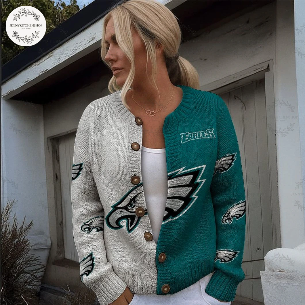 Unlike many competitor designs that simply slap a logo onto a standard sweater, this piece feels integrated, intentional. The knit pattern itself, visible in the images, gives the cardigan a tactile richness, suggesting quality and warmth, making those iconic logos pop with a textural depth that a simple print could never achieve. This isn’t just merchandise; it’s wearable art, a celebration of Eagles heritage infused with a fresh, contemporary aesthetic, designed to stand out in a sea of sameness.