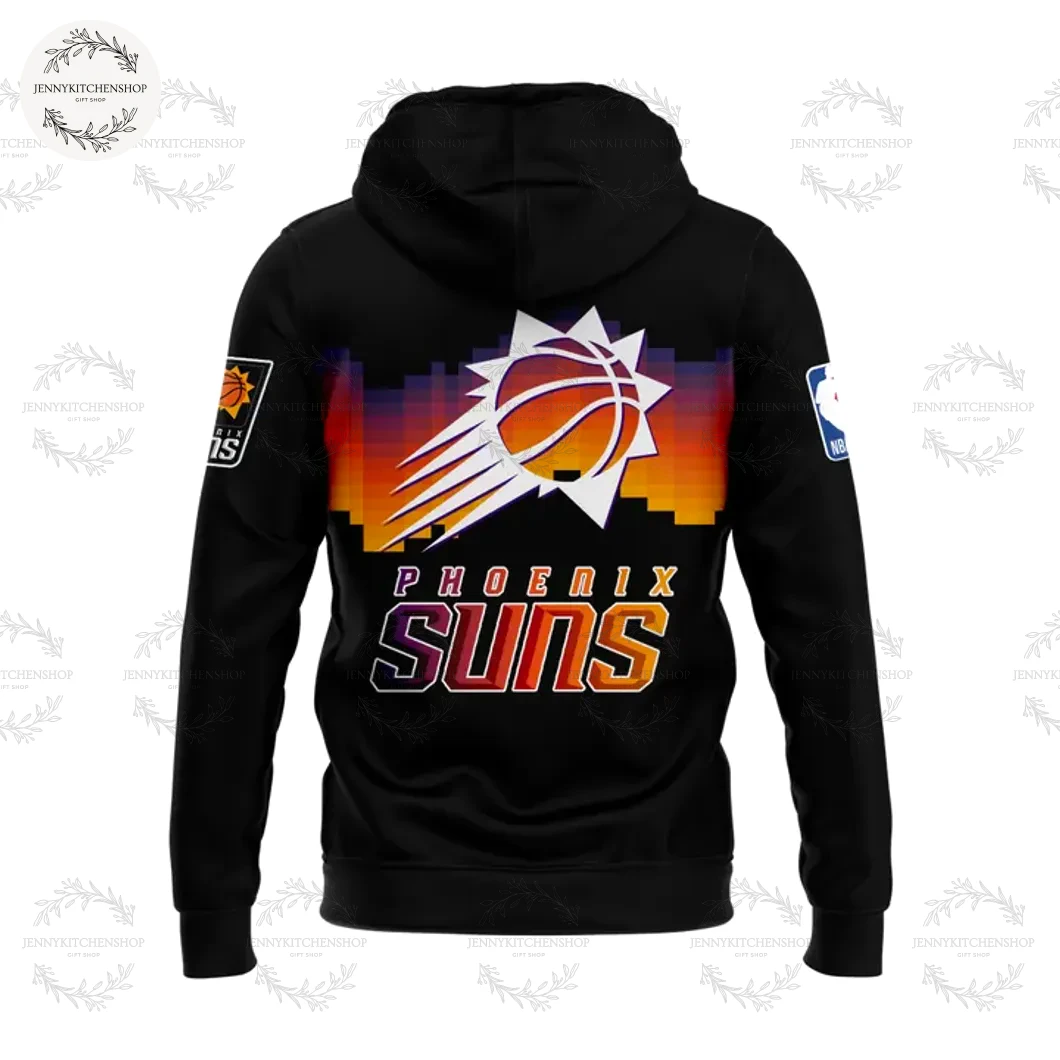 Flip the hoodie, and the narrative continues. The back is dominated by an even larger, more dramatic rendition of the pixelated sunset gradient. This time, a colossal sun-with-basketball emblem takes center stage, its powerful rays stretching across the vibrant backdrop. Below it, “PHOENIX” is written in a clean, uppercase font, followed by “SUNS” in a gradient that mirrors the sunset, creating a dynamic visual flow. This expansive back graphic is a declaration, a beacon of loyalty that radiates strength and pride. It’s designed to make a statement, whether you’re walking into the arena, representing your team at a watch party, or simply carrying the spirit of “The Valley” with you.