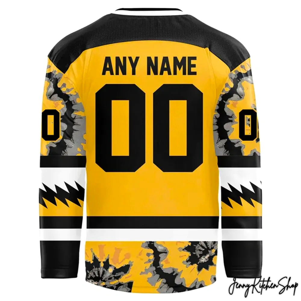 - Psychedelic Swirls Meet Hockey Stripes: Journey down the sleeves and the lower body, and you’ll discover the true artistry of this crossover. A unique, organic tie-dye or splattered pattern in shades of black, white, and a muted gold dances across the fabric. This isn’t a random pattern; it’s a carefully orchestrated visual melody, reminiscent of the swirling light shows at a Dead concert, seamlessly integrated with the structured lines of a hockey jersey. This expressive pattern pushes beyond typical team graphics, offering a depth and artistic flair that generic fan apparel simply can’t match. It’s where the free spirit of the jam scene meets the organized chaos of the game.