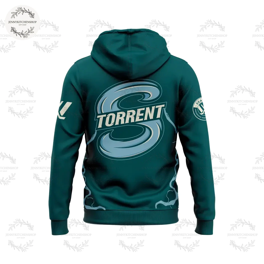 • The Unstoppable Current: Back Design: Turning around, the back of the hoodie showcases an even more expansive and impactful iteration of the stylized ‘S’ logo. Here, its swirling, water-like patterns are amplified, stretching across the back to command attention. The integration of the “TORRENT” text within and around the ‘S’ is more pronounced, emphasizing the team’s name as an integral part of its very identity and strength. The designer’s intent here was to create a visual “wake” – that powerful trail left by something unstoppable – symbolizing the team’s indelible mark on the league and the hearts of its fans. This large, dynamic graphic ensures that your loyalty is visible from every angle, reflecting the broad, sweeping support of the Seattle community.