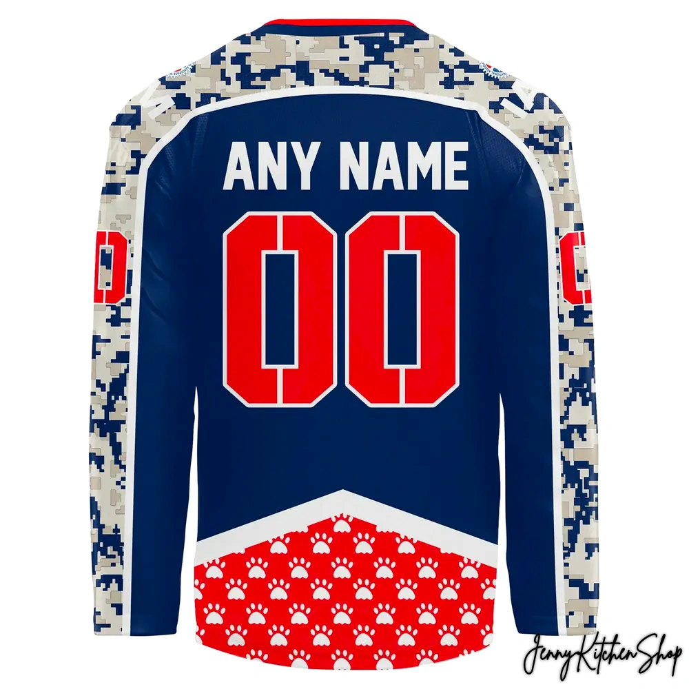 - The Heartwarming Paw Print Motif: Perhaps the most emotionally resonant and uniquely differentiating feature, the lower red panel is adorned with an endearing white paw print pattern. This artistic decision by the designer profoundly connects the jersey to its charitable mission: supporting Guide Dogs of America and Tender Loving Canines. It’s a tender, yet powerful, visual reminder that every wear champions the incredible bond between service members and their companion animals. Competitors often miss this direct, heartfelt visual link, making this jersey truly stand out.