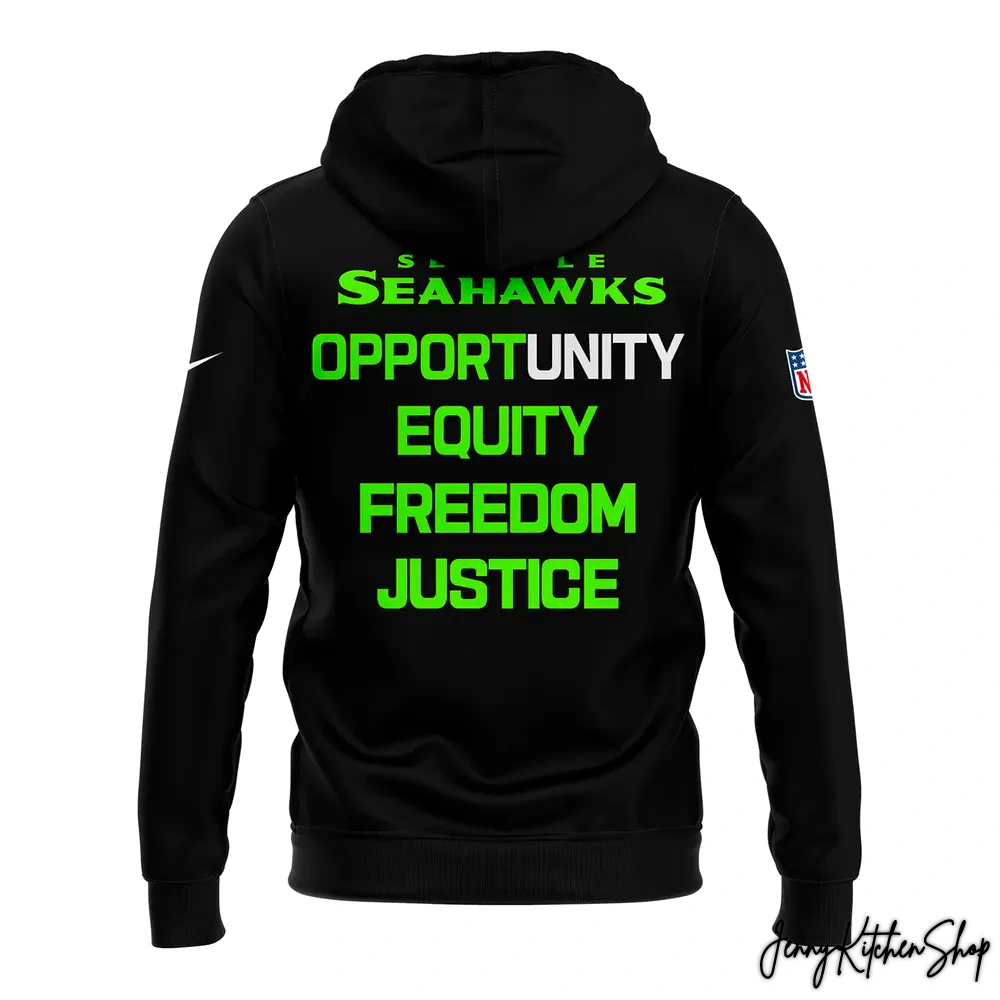 • The Back: A Bold Declaration: Turning to the back, the message gains even more momentum. “SEATTLE SEAHAWKS” is proudly emblazoned across the upper back in the same vibrant neon green, ensuring there’s no doubt whose colors you fly. Below this, the words “OPPORTUNITY,” “EQUITY,” “FREEDOM,” and “JUSTICE” are stacked vertically, each word commanding its own line in the same powerful neon green. This deliberate arrangement amplifies each term, making the hoodie a walking billboard for the cause. The designer chose this bold, stacked presentation to maximize impact and ensure that the message is readable from a distance, making a statement wherever you go. Again, a subtle white brand mark is present on the top left shoulder, mirroring the league shield logo on the top right, tying the entire design together with a unified aesthetic.