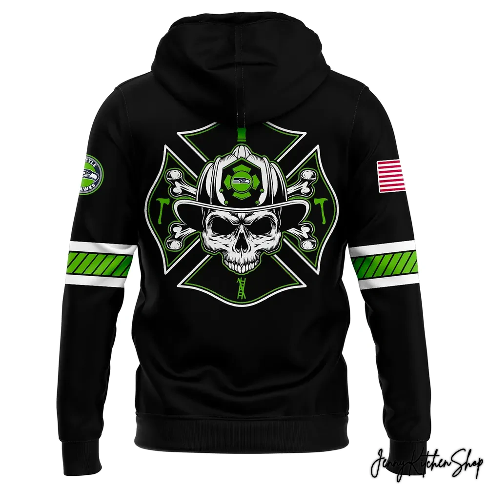 Turning to the back, the storytelling continues with an equally impactful design. A formidable skull, adorned with a classic firefighter helmet, takes center stage. But this isn’t just any helmet; upon its front, the instantly recognizable Seahawks eagle logo is proudly displayed, merging the essence of a hero with the heart of a champion. This skull is set against the revered Maltese cross, a timeless emblem of courage, sacrifice, and loyalty within the firefighting community. Behind the skull, subtle crossed bones add an edge of resilience and toughness. The entire rear graphic is meticulously outlined in the signature Seahawks green and white, creating a powerful, harmonious visual against the black background. A matching American flag graces the right sleeve, balancing the patriotic tribute seen on the front.