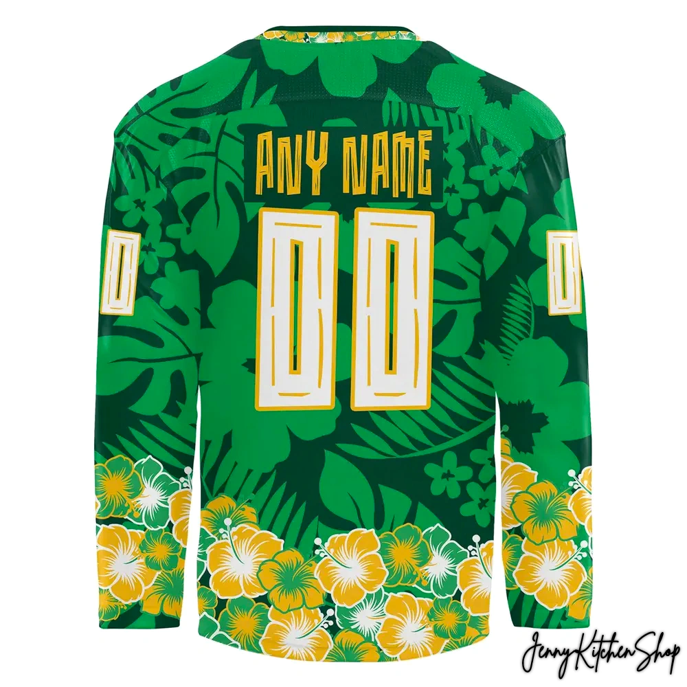 Let’s dive into the design that sets this jersey apart. The base is an absolutely electrifying, deep tropical green, serving as the perfect backdrop for a lush, full-coverage pattern. This isn’t a subtle detail; it’s an immersive experience. Darker green, broad-leafed foliage, reminiscent of monstera and palm leaves, creates a dense, authentic jungle canopy across the entire jersey, front and back. But peeking through this verdant expanse are bursts of sunshine: vibrant yellow and crisp white hibiscus flowers, scattered generously, bringing that unmistakable Hawaiian bloom directly to your chest and sleeves. Each petal and leaf is rendered with a dynamic quality, as if swaying in a gentle island breeze.