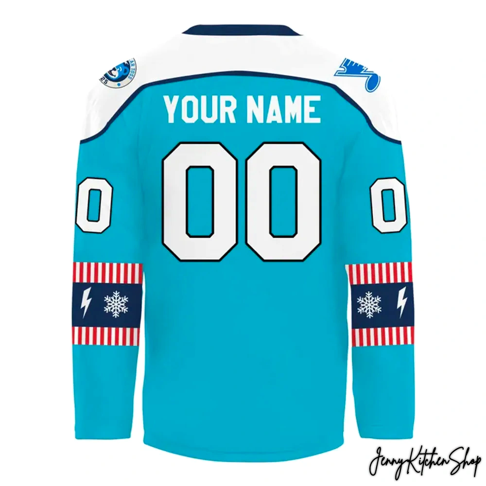 Prepare to make a grand entrance, whether you’re heading to the rink, a holiday gathering, or just spreading cheer around town. This stunning Springfield Thunderbirds Merry Christmas 2025 Hockey Jersey is a masterclass in festive fan design, meticulously crafted to catch every eye and ignite every fan’s heart. The primary canvas is a vibrant, unmistakable aqua blue – a refreshing take on traditional holiday colors that perfectly mirrors the crispness of a winter ice sheet. This isn’t just a color; it’s the invigorating hue of a fresh pond skate, the sparkle of a clear winter sky, the very essence of a T-Birds winter wonderland.