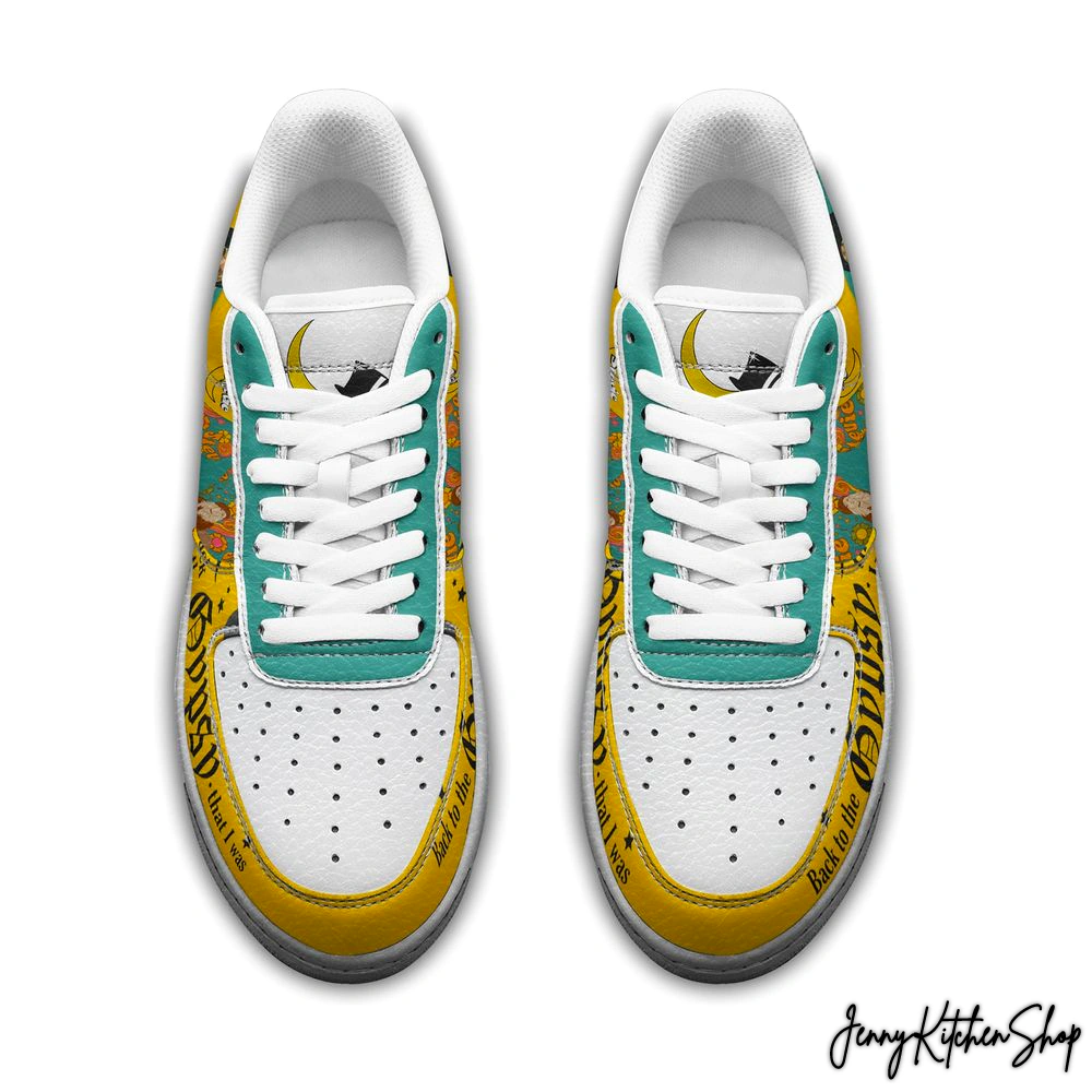 Turn the sneakers around, and the artistry continues. The heel tabs proudly display “Stevie Nicks” in a flowing, bespoke script font, mirroring the elegant lettering found on the tongue patch. This distinctive typography isn’t just a name; it’s a signature, a brand of magic that makes each step a declaration of fandom. The teal of the heel tab and the yellow base create a cohesive, eye-catching design from every angle, ensuring that your devotion is celebrated from forefoot to heel.